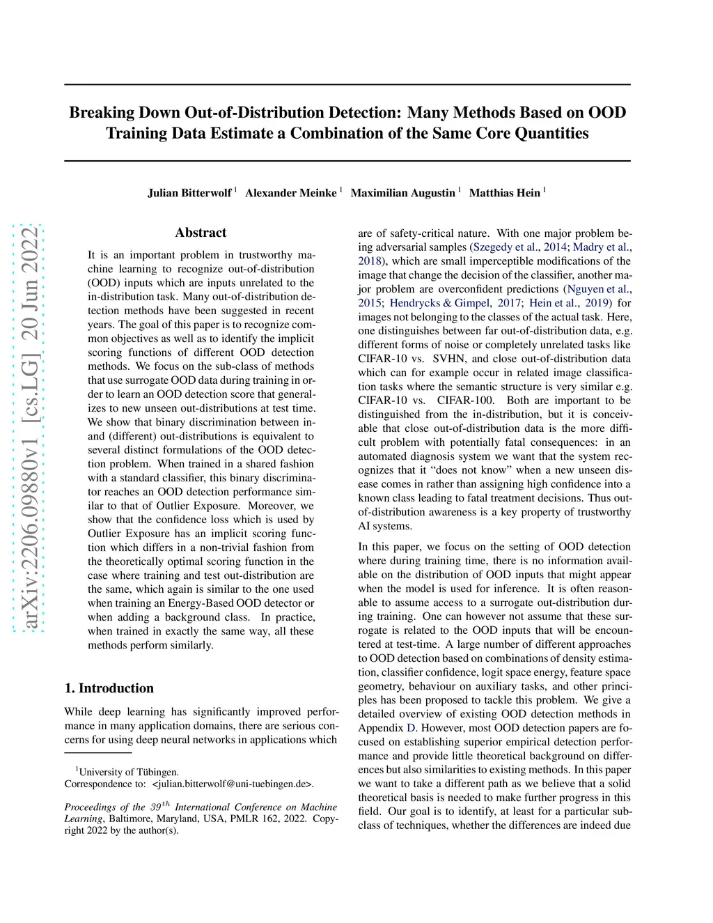 It is an important problem in trustworthy machine learning to recognize out-of-distribution (OOD) inputs which are inputs unrelated to the in-distribution task. Many out-of-distribution detection methods have been suggested in recent years. The goal of this paper is to recognize common objectives as well as to identify the implicit scoring functions of different OOD detection methods. We focus on the sub-class of methods that use surrogate OOD data during training in order to learn an OOD detection score that generalizes to new unseen out-distributions at test time. We show that binary discrimination between in- and (different) out-distributions is equivalent to several distinct formulations of the OOD detection problem. When trained in a shared fashion with a standard classifier, this binary discriminator reaches an OOD detection performance similar to that of Outlier Exposure. Moreover, we show that the confidence loss which is used by Outlier Exposure has an implicit scoring function which differs in a non-trivial fashion from the theoretically optimal scoring function in the case where training and test out-distribution are the same, which again is similar to the one used when training an Energy-Based OOD detector or when adding a background class. In practice, when trained in exactly the same way, all these methods perform similarly.