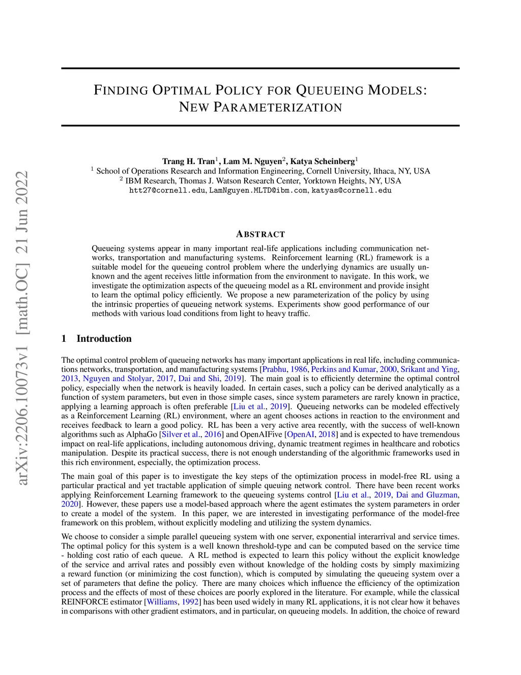 Queueing systems appear in many important real-life applications including communication networks, transportation and manufacturing systems. Reinforcement learning (RL) framework is a suitable model for the queueing control problem where the underlying dynamics are usually unknown and the agent receives little information from the environment to navigate. In this work, we investigate the optimization aspects of the queueing model as a RL environment and provide insight to learn the optimal policy efficiently. We propose a new parameterization of the policy by using the intrinsic properties of queueing network systems. Experiments show good performance of our methods with various load conditions from light to heavy traffic.
