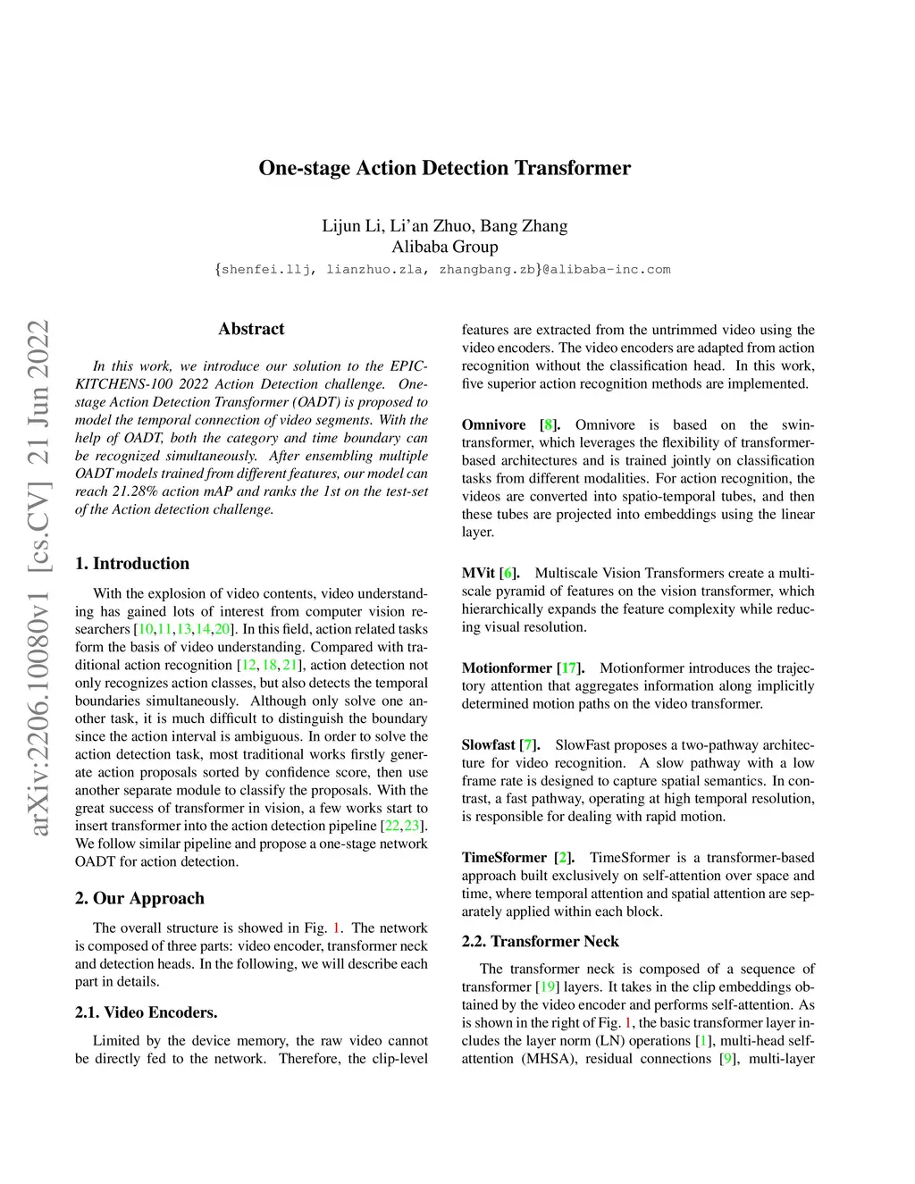In this work, we introduce our solution to the EPIC-KITCHENS-100 2022 Action Detection challenge. One-stage Action Detection Transformer (OADT) is proposed to model the temporal connection of video segments. With the help of OADT, both the category and time boundary can be recognized simultaneously. After ensembling multiple OADT models trained from different features, our model can reach 21.28\% action mAP and ranks the 1st on the test-set of the Action detection challenge.