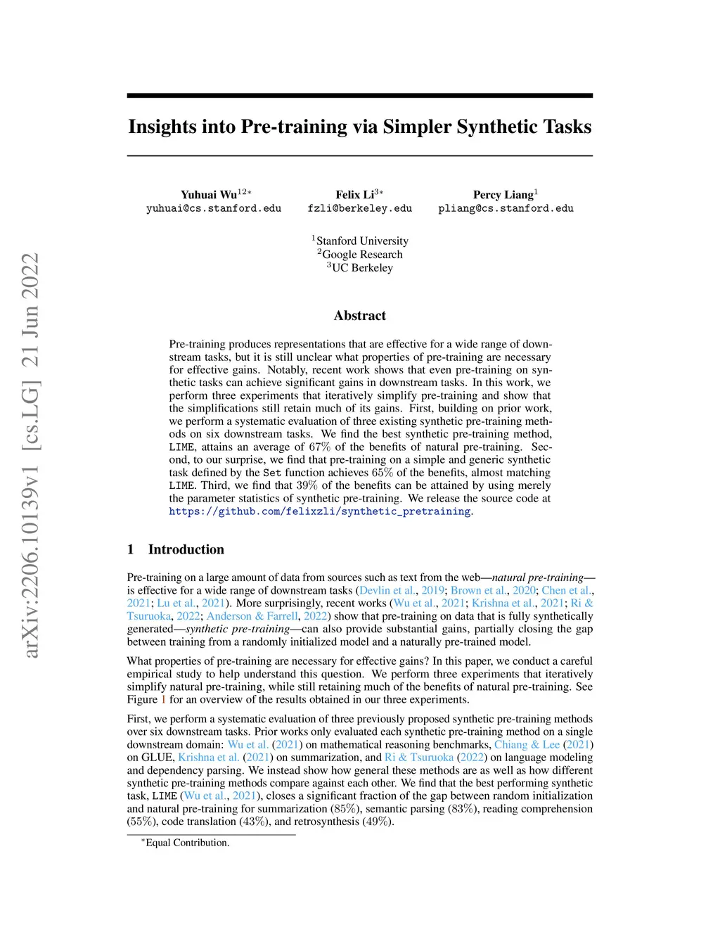 Pre-training produces representations that are effective for a wide range of downstream tasks, but it is still unclear what properties of pre-training are necessary for effective gains. Notably, recent work shows that even pre-training on synthetic tasks can achieve significant gains in downstream tasks. In this work, we perform three experiments that iteratively simplify pre-training and show that the simplifications still retain much of its gains. First, building on prior work, we perform a systematic evaluation of three existing synthetic pre-training methods on six downstream tasks. We find the best synthetic pre-training method, LIME, attains an average of of the benefits of natural pre-training. Second, to our surprise, we find that pre-training on a simple and generic synthetic task defined by the Set function achieves of the benefits, almost matching LIME. Third, we find that of the benefits can be attained by using merely the parameter statistics of synthetic pre-training. We release the source code at https://github.com/felixzli/synthetic_pretraining.