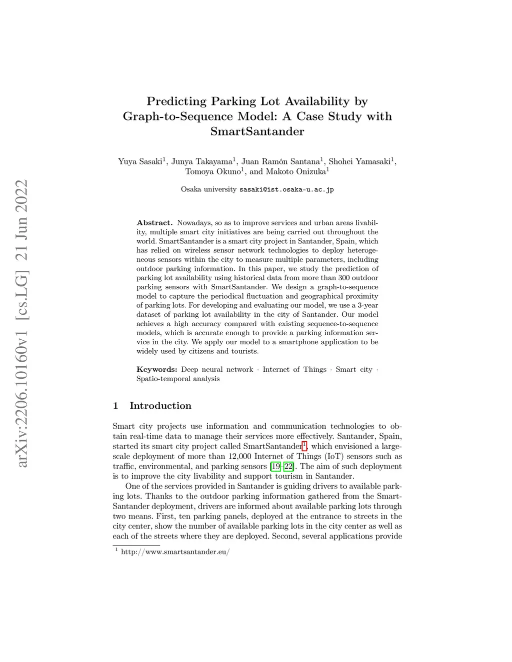 Nowadays, so as to improve services and urban areas livability, multiple smart city initiatives are being carried out throughout the world. SmartSantander is a smart city project in Santander, Spain, which has relied on wireless sensor network technologies to deploy heterogeneous sensors within the city to measure multiple parameters, including outdoor parking information. In this paper, we study the prediction of parking lot availability using historical data from more than 300 outdoor parking sensors with SmartSantander. We design a graph-to-sequence model to capture the periodical fluctuation and geographical proximity of parking lots. For developing and evaluating our model, we use a 3-year dataset of parking lot availability in the city of Santander. Our model achieves a high accuracy compared with existing sequence-to-sequence models, which is accurate enough to provide a parking information service in the city. We apply our model to a smartphone application to be widely used by citizens and tourists.