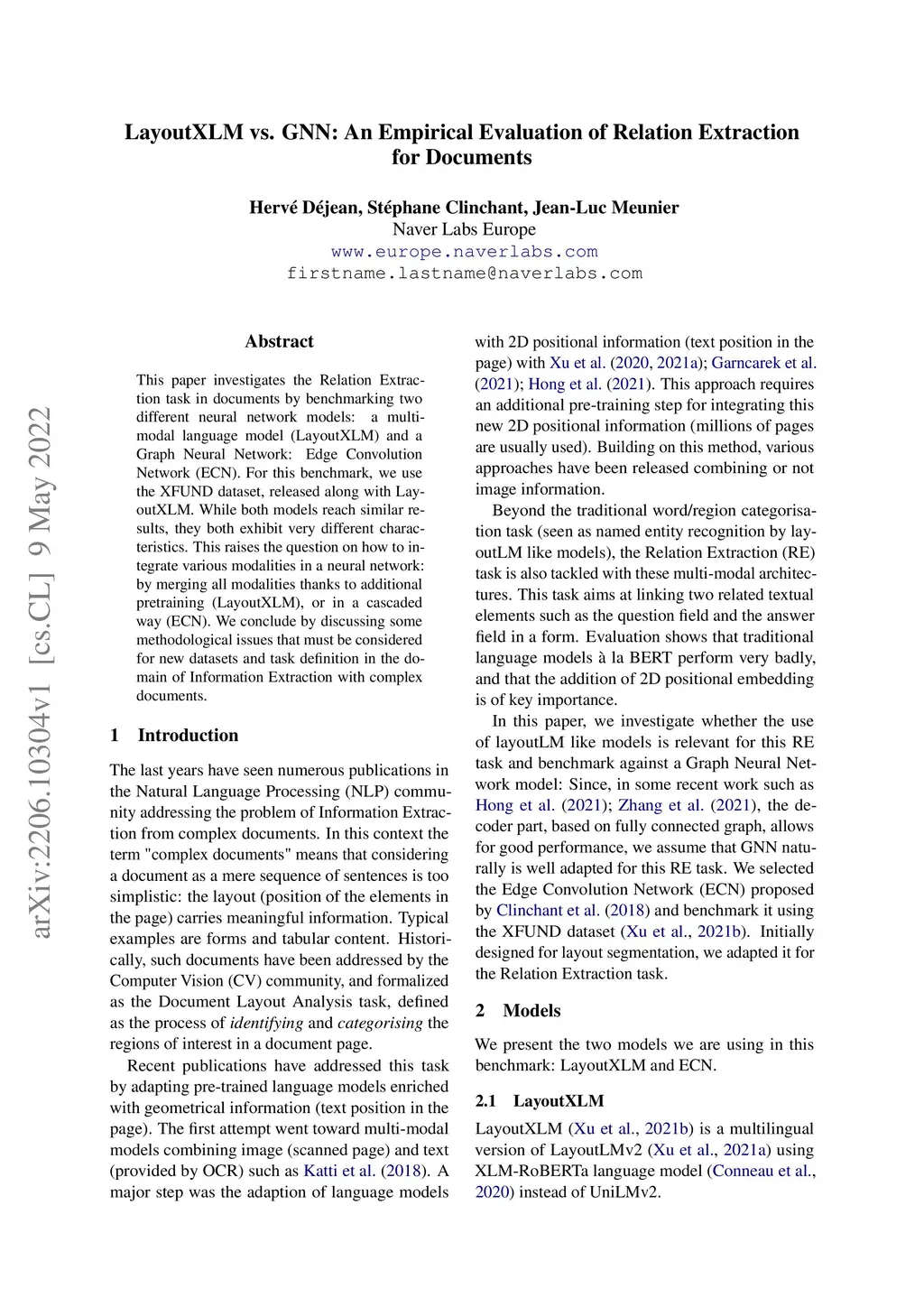 This paper investigates the Relation Extraction task in documents by benchmarking two different neural network models: a multi-modal language model (LayoutXLM) and a Graph Neural Network: Edge Convolution Network (ECN). For this benchmark, we use the XFUND dataset, released along with LayoutXLM. While both models reach similar results, they both exhibit very different characteristics. This raises the question on how to integrate various modalities in a neural network: by merging all modalities thanks to additional pretraining (LayoutXLM), or in a cascaded way (ECN). We conclude by discussing some methodological issues that must be considered for new datasets and task definition in the domain of Information Extraction with complex documents.