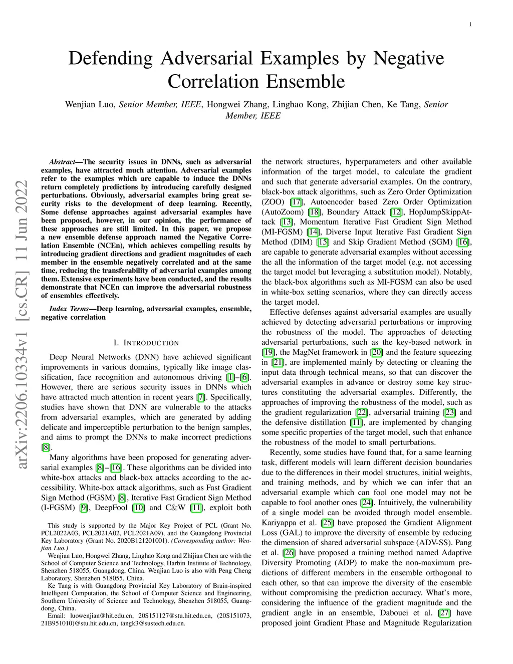 The security issues in DNNs, such as adversarial examples, have attracted much attention. Adversarial examples refer to the examples which are capable to induce the DNNs return completely predictions by introducing carefully designed perturbations. Obviously, adversarial examples bring great security risks to the development of deep learning. Recently, Some defense approaches against adversarial examples have been proposed, however, in our opinion, the performance of these approaches are still limited. In this paper, we propose a new ensemble defense approach named the Negative Correlation Ensemble (NCEn), which achieves compelling results by introducing gradient directions and gradient magnitudes of each member in the ensemble negatively correlated and at the same time, reducing the transferability of adversarial examples among them. Extensive experiments have been conducted, and the results demonstrate that NCEn can improve the adversarial robustness of ensembles effectively.