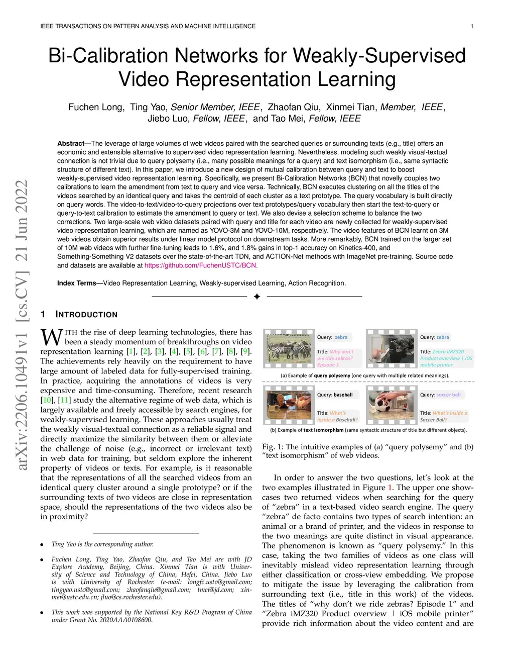 The leverage of large volumes of web videos paired with the searched queries or surrounding texts (e.g., title) offers an economic and extensible alternative to supervised video representation learning. Nevertheless, modeling such weakly visual-textual connection is not trivial due to query polysemy (i.e., many possible meanings for a query) and text isomorphism (i.e., same syntactic structure of different text). In this paper, we introduce a new design of mutual calibration between query and text to boost weakly-supervised video representation learning. Specifically, we present Bi-Calibration Networks (BCN) that novelly couples two calibrations to learn the amendment from text to query and vice versa. Technically, BCN executes clustering on all the titles of the videos searched by an identical query and takes the centroid of each cluster as a text prototype. The query vocabulary is built directly on query words. The video-to-text/video-to-query projections over text prototypes/query vocabulary then start the text-to-query or query-to-text calibration to estimate the amendment to query or text. We also devise a selection scheme to balance the two corrections. Two large-scale web video datasets paired with query and title for each video are newly collected for weakly-supervised video representation learning, which are named as YOVO-3M and YOVO-10M, respectively. The video features of BCN learnt on 3M web videos obtain superior results under linear model protocol on downstream tasks. More remarkably, BCN trained on the larger set of 10M web videos with further fine-tuning leads to 1.6%, and 1.8% gains in top-1 accuracy on Kinetics-400, and Something-Something V2 datasets over the state-of-the-art TDN, and ACTION-Net methods with ImageNet pre-training. Source code and datasets are available at \url{https://github.com/FuchenUSTC/BCN}.