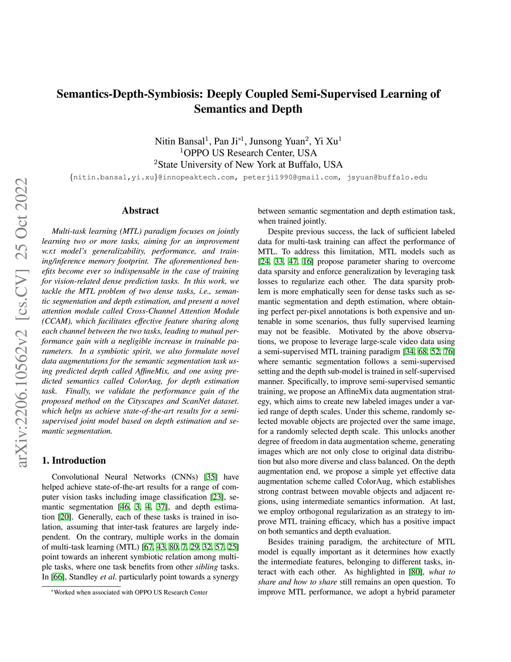 Multi-task learning (MTL) paradigm focuses on jointly learning two or more tasks, aiming for significant improvement w.r.t model's generalizability, performance, and training/inference memory footprint. The aforementioned benefits become ever so indispensable in the case of joint training for vision-related {\bf dense} prediction tasks. In this work, we tackle the MTL problem of two dense tasks, i.e., semantic segmentation and depth estimation, and present a novel attention module called Cross-Channel Attention Module ({CCAM}), which facilitates effective feature sharing along each channel between the two tasks, leading to mutual performance gain with a negligible increase in trainable parameters. In a true symbiotic spirit, we then formulate a novel data augmentation for the semantic segmentation task using predicted depth called {AffineMix}, and a simple depth augmentation using predicted semantics called {ColorAug}. Finally, we validate the performance gain of the proposed method on the Cityscapes and ScanNet dataset, which helps us achieve state-of-the-art results for a semi-supervised joint model based on depth and semantic segmentation.