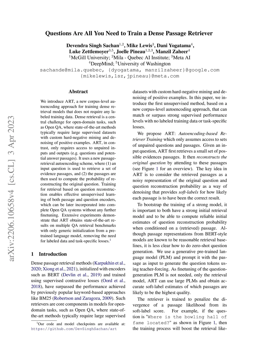 Questions Are All You Need to Train a Dense Passage Retriever