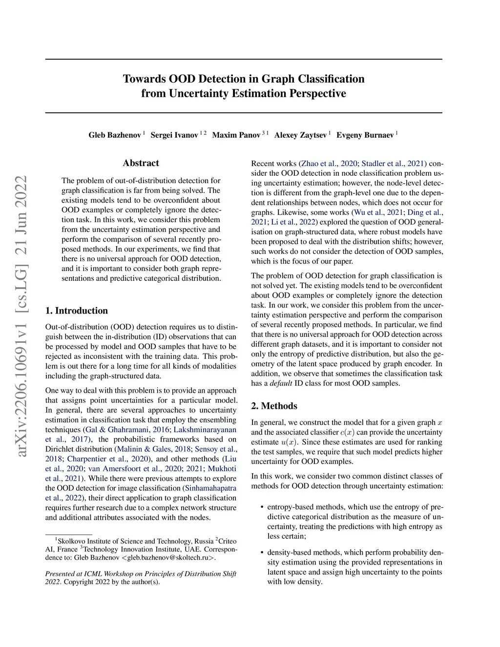 The problem of out-of-distribution detection for graph classification is far from being solved. The existing models tend to be overconfident about OOD examples or completely ignore the detection task. In this work, we consider this problem from the uncertainty estimation perspective and perform the comparison of several recently proposed methods. In our experiment, we find that there is no universal approach for OOD detection, and it is important to consider both graph representations and predictive categorical distribution.