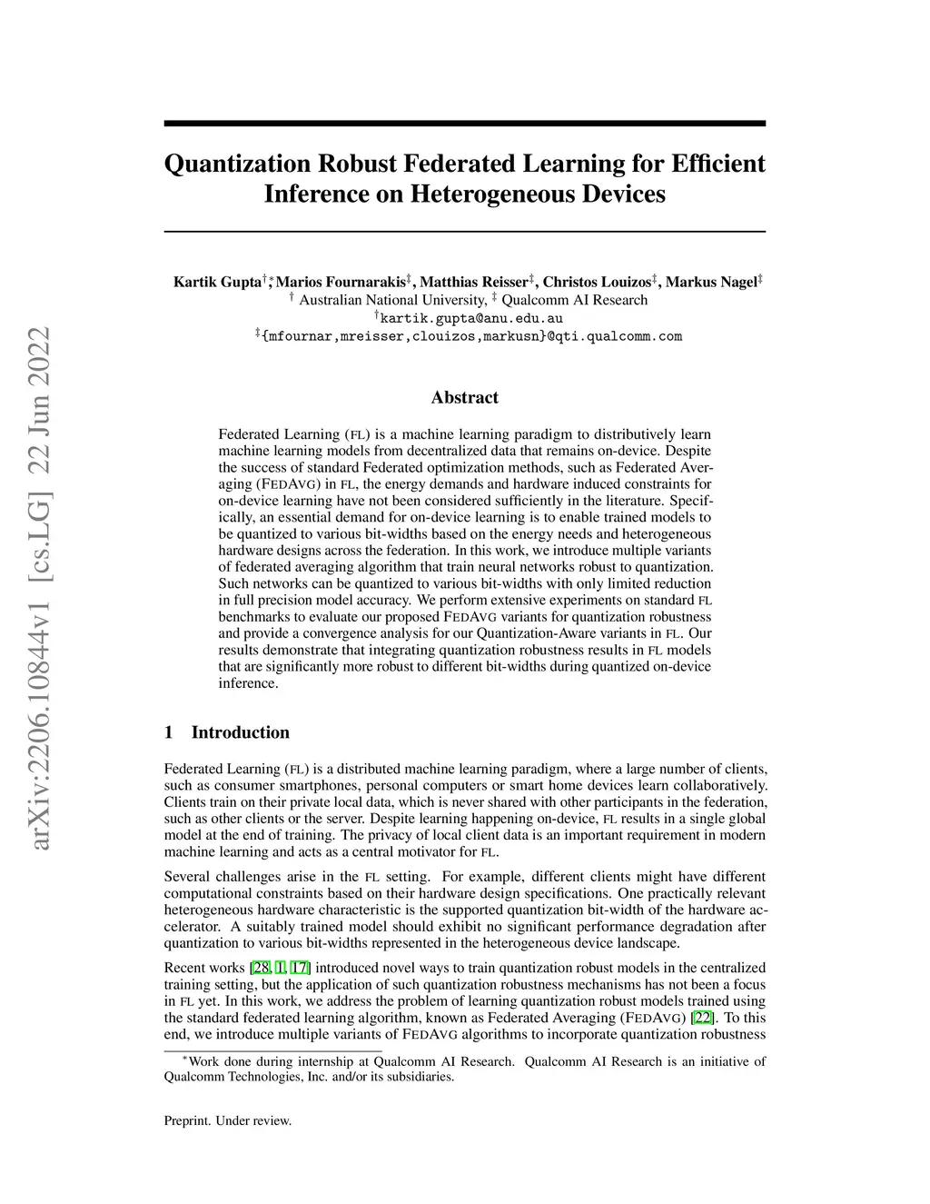 Federated Learning (FL) is a machine learning paradigm to distributively learn machine learning models from decentralized data that remains on-device. Despite the success of standard Federated optimization methods, such as Federated Averaging (FedAvg) in FL, the energy demands and hardware induced constraints for on-device learning have not been considered sufficiently in the literature. Specifically, an essential demand for on-device learning is to enable trained models to be quantized to various bit-widths based on the energy needs and heterogeneous hardware designs across the federation. In this work, we introduce multiple variants of federated averaging algorithm that train neural networks robust to quantization. Such networks can be quantized to various bit-widths with only limited reduction in full precision model accuracy. We perform extensive experiments on standard FL benchmarks to evaluate our proposed FedAvg variants for quantization robustness and provide a convergence analysis for our Quantization-Aware variants in FL. Our results demonstrate that integrating quantization robustness results in FL models that are significantly more robust to different bit-widths during quantized on-device inference.