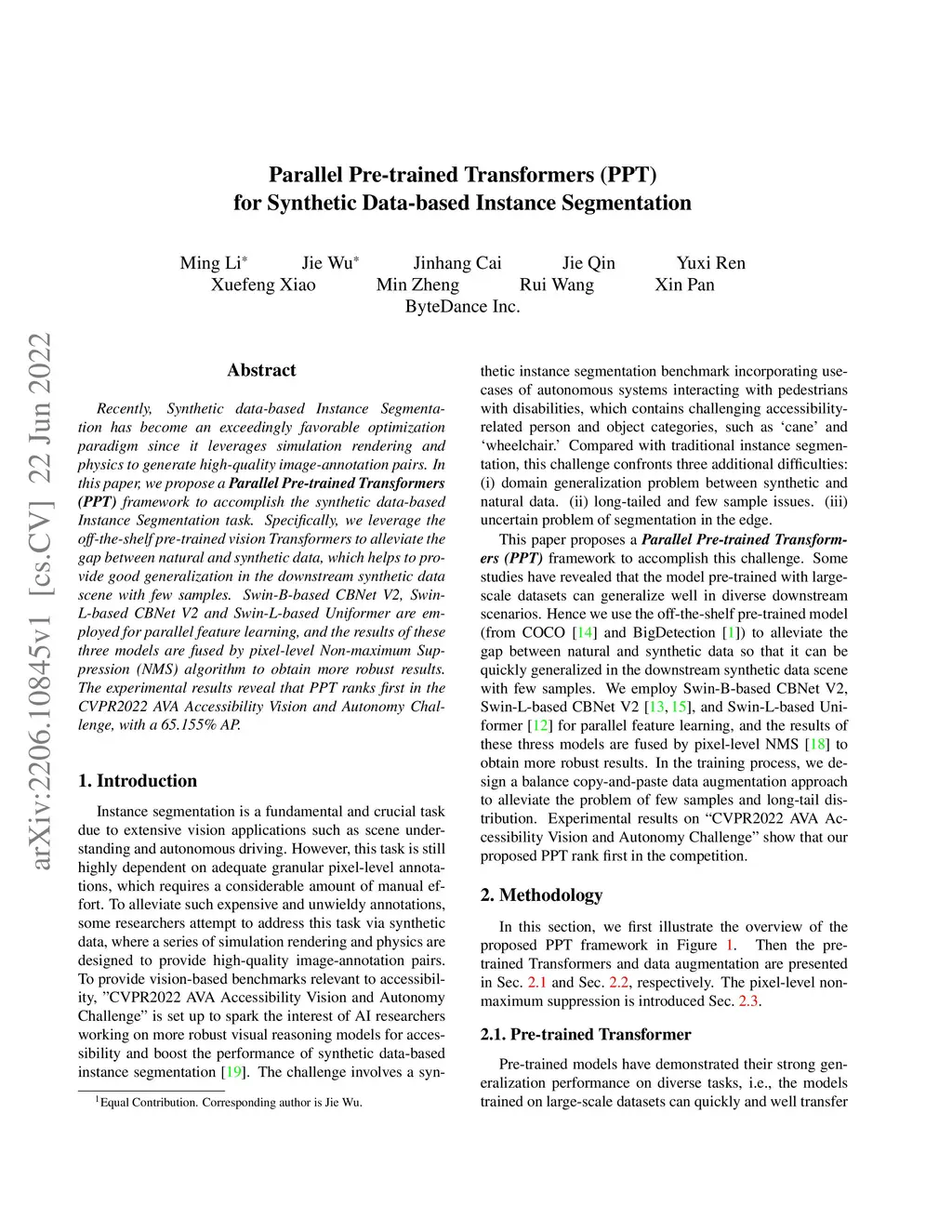 Recently, Synthetic data-based Instance Segmentation has become an exceedingly favorable optimization paradigm since it leverages simulation rendering and physics to generate high-quality image-annotation pairs. In this paper, we propose a Parallel Pre-trained Transformers (PPT) framework to accomplish the synthetic data-based Instance Segmentation task. Specifically, we leverage the off-the-shelf pre-trained vision Transformers to alleviate the gap between natural and synthetic data, which helps to provide good generalization in the downstream synthetic data scene with few samples. Swin-B-based CBNet V2, SwinL-based CBNet V2 and Swin-L-based Uniformer are employed for parallel feature learning, and the results of these three models are fused by pixel-level Non-maximum Suppression (NMS) algorithm to obtain more robust results. The experimental results reveal that PPT ranks first in the CVPR2022 AVA Accessibility Vision and Autonomy Challenge, with a 65.155% mAP.