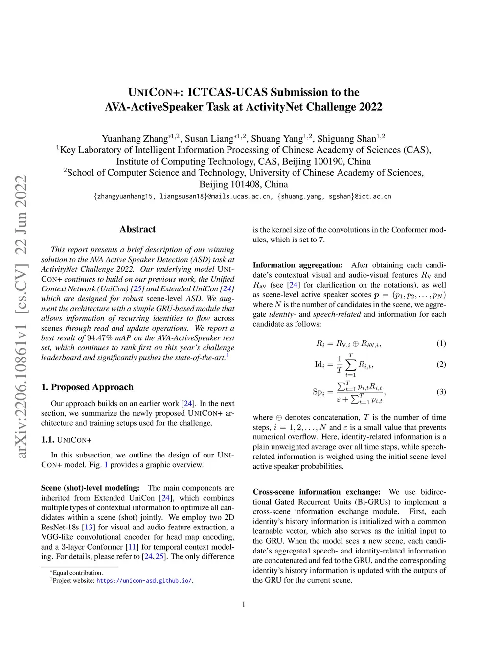 This report presents a brief description of our winning solution to the AVA Active Speaker Detection (ASD) task at ActivityNet Challenge 2022. Our underlying model UniCon+ continues to build on our previous work, the Unified Context Network (UniCon) and Extended UniCon which are designed for robust scene-level ASD. We augment the architecture with a simple GRU-based module that allows information of recurring identities to flow across scenes through read and update operations. We report a best result of 94.47% mAP on the AVA-ActiveSpeaker test set, which continues to rank first on this year's challenge leaderboard and significantly pushes the state-of-the-art.