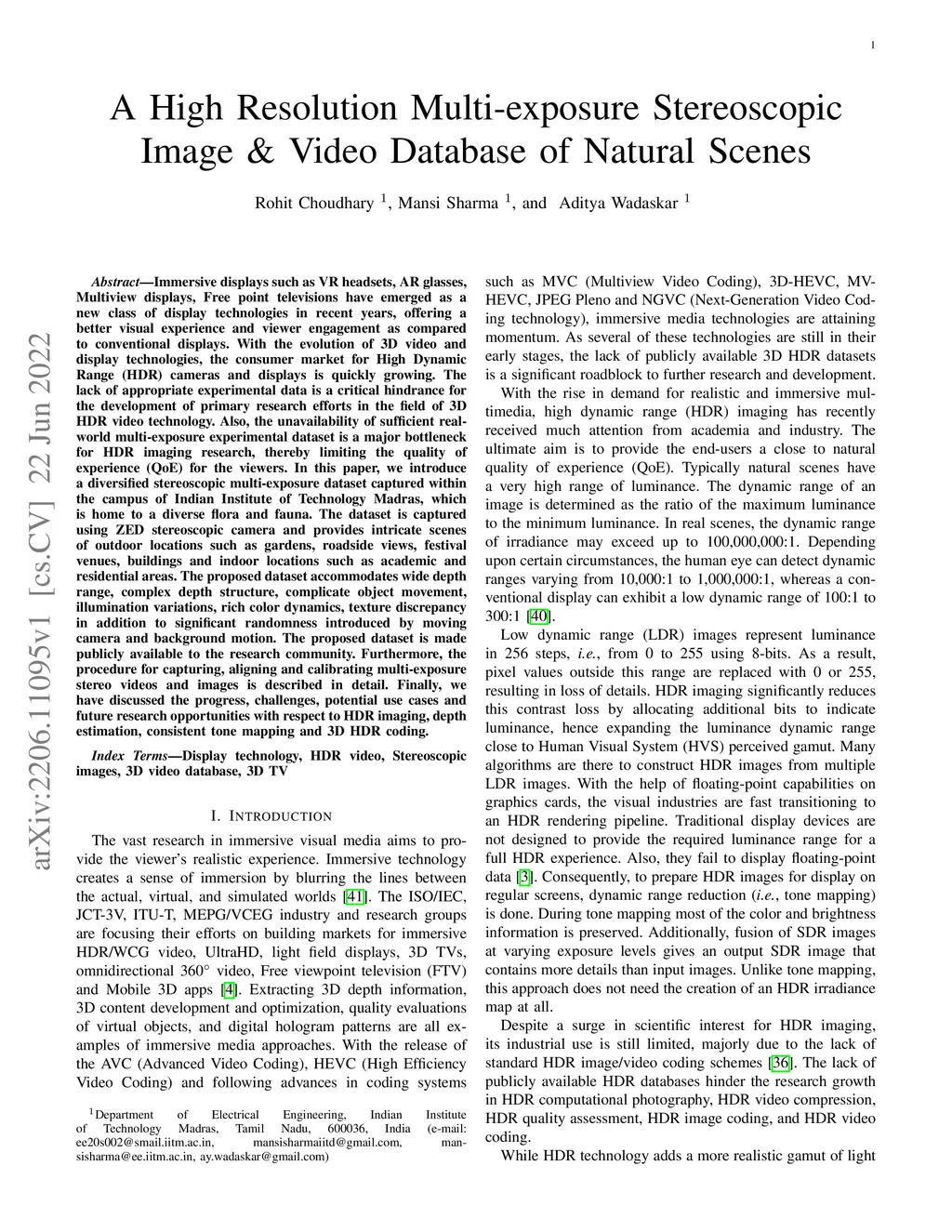 Immersive displays such as VR headsets, AR glasses, Multiview displays, Free point televisions have emerged as a new class of display technologies in recent years, offering a better visual experience and viewer engagement as compared to conventional displays. With the evolution of 3D video and display technologies, the consumer market for High Dynamic Range (HDR) cameras and displays is quickly growing. The lack of appropriate experimental data is a critical hindrance for the development of primary research efforts in the field of 3D HDR video technology. Also, the unavailability of sufficient real world multi-exposure experimental dataset is a major bottleneck for HDR imaging research, thereby limiting the quality of experience (QoE) for the viewers. In this paper, we introduce a diversified stereoscopic multi-exposure dataset captured within the campus of Indian Institute of Technology Madras, which is home to a diverse flora and fauna. The dataset is captured using ZED stereoscopic camera and provides intricate scenes of outdoor locations such as gardens, roadside views, festival venues, buildings and indoor locations such as academic and residential areas. The proposed dataset accommodates wide depth range, complex depth structure, complicate object movement, illumination variations, rich color dynamics, texture discrepancy in addition to significant randomness introduced by moving camera and background motion. The proposed dataset is made publicly available to the research community. Furthermore, the procedure for capturing, aligning and calibrating multi-exposure stereo videos and images is described in detail. Finally, we have discussed the progress, challenges, potential use cases and future research opportunities with respect to HDR imaging, depth estimation, consistent tone mapping and 3D HDR coding.