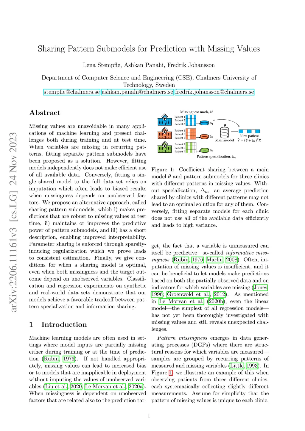 Missing values are unavoidable in many applications of machine learning and present challenges both during training and at test time. When variables are missing in recurring patterns, fitting separate pattern submodels have been proposed as a solution. However, fitting models independently does not make efficient use of all available data. Conversely, fitting a single shared model to the full data set relies on imputation which often leads to biased results when missingness depends on unobserved factors. We propose an alternative approach, called sharing pattern submodels, which i) makes predictions that are robust to missing values at test time, ii) maintains or improves the predictive power of pattern submodels, and iii) has a short description, enabling improved interpretability. Parameter sharing is enforced through sparsity-inducing regularization which we prove leads to consistent estimation. Finally, we give conditions for when a sharing model is optimal, even when both missingness and the target outcome depend on unobserved variables. Classification and regression experiments on synthetic and real-world data sets demonstrate that our models achieve a favorable tradeoff between pattern specialization and information sharing.