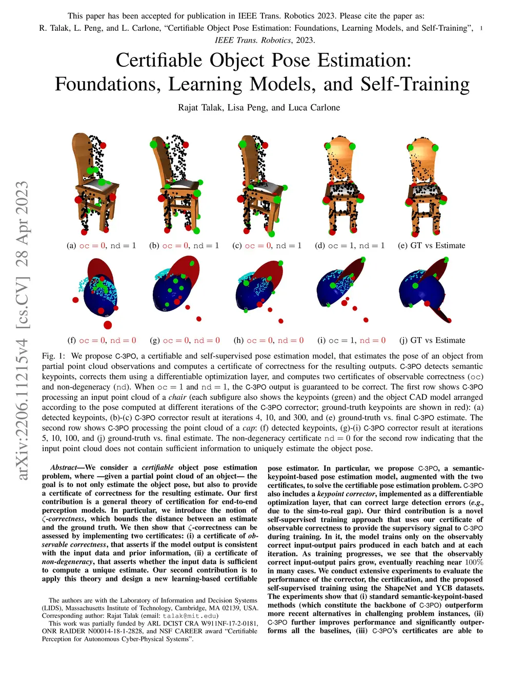 We consider a certifiable object pose estimation problem, where -- given a partial point cloud of an object -- the goal is to not only estimate the object pose, but also to provide a certificate of correctness for the resulting estimate. Our first contribution is a general theory of certification for end-to-end perception models. In particular, we introduce the notion of -correctness, which bounds the distance between an estimate and the ground truth. We show that -correctness can be assessed by implementing two certificates: (i) a certificate of observable correctness, that asserts if the model output is consistent with the input data and prior information, (ii) a certificate of non-degeneracy, that asserts whether the input data is sufficient to compute a unique estimate. Our second contribution is to apply this theory and design a new learning-based certifiable pose estimator. We propose C-3PO, a semantic-keypoint-based pose estimation model, augmented with the two certificates, to solve the certifiable pose estimation problem. C-3PO also includes a keypoint corrector, implemented as a differentiable optimization layer, that can correct large detection errors (e.g. due to the sim-to-real gap). Our third contribution is a novel self-supervised training approach that uses our certificate of observable correctness to provide the supervisory signal to C-3PO during training. In it, the model trains only on the observably correct input-output pairs, in each training iteration. As training progresses, we see that the observably correct input-output pairs grow, eventually reaching near 100% in many cases. Our experiments show that (i) standard semantic-keypoint-based methods outperform more recent alternatives, (ii) C-3PO further improves performance and significantly outperforms all the baselines, and (iii) C-3PO's certificates are able to discern correct pose estimates.