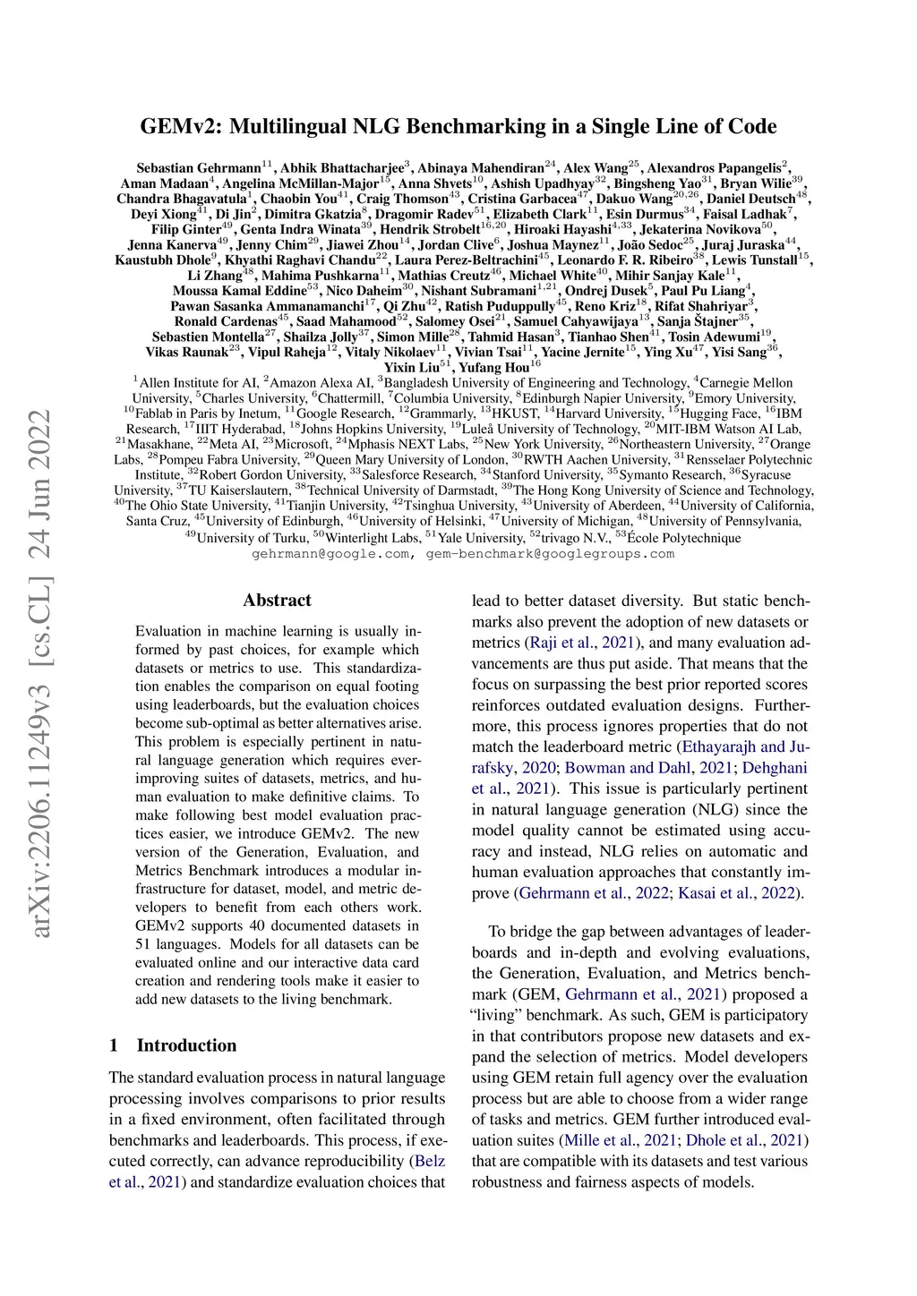 GEMv2: Multilingual NLG Benchmarking in a Single Line of Code