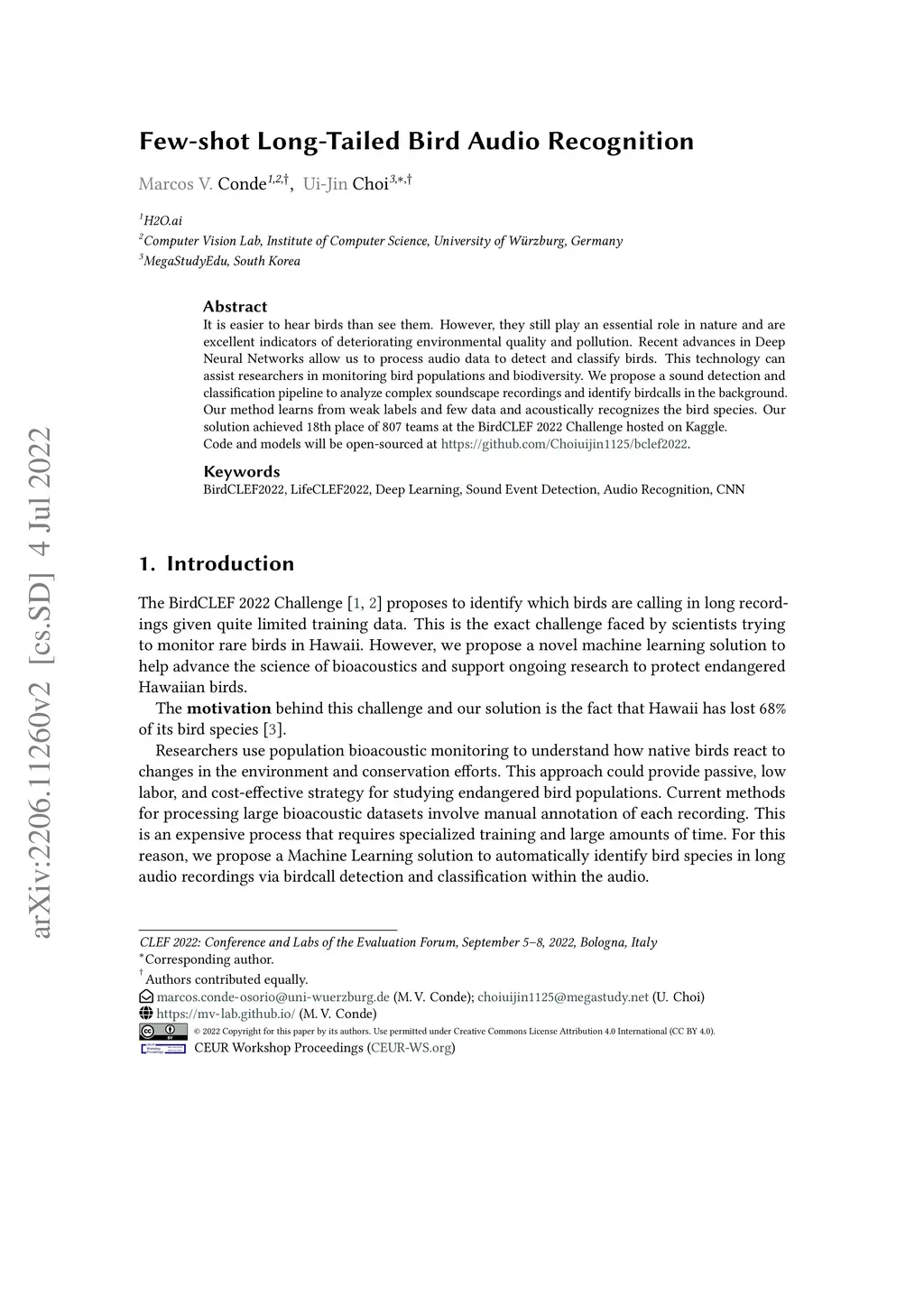 It is easier to hear birds than see them. However, they still play an essential role in nature and are excellent indicators of deteriorating environmental quality and pollution. Recent advances in Machine Learning and Convolutional Neural Networks allow us to process continuous audio data to detect and classify bird sounds. This technology can assist researchers in monitoring bird populations' status and trends and ecosystems' biodiversity. We propose a sound detection and classification pipeline to analyze complex soundscape recordings and identify birdcalls in the background. Our method learns from weak labels and few data and acoustically recognizes the bird species. Our solution achieved 18th place of 807 teams at the BirdCLEF 2022 Challenge hosted on Kaggle.