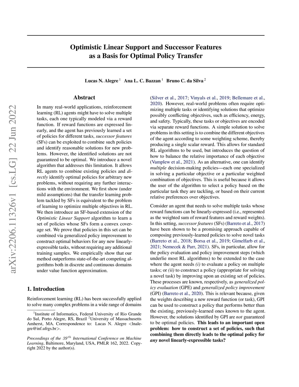 In many real-world applications, reinforcement learning (RL) agents might have to solve multiple tasks, each one typically modeled via a reward function. If reward functions are expressed linearly, and the agent has previously learned a set of policies for different tasks, successor features (SFs) can be exploited to combine such policies and identify reasonable solutions for new problems. However, the identified solutions are not guaranteed to be optimal. We introduce a novel algorithm that addresses this limitation. It allows RL agents to combine existing policies and directly identify optimal policies for arbitrary new problems, without requiring any further interactions with the environment. We first show (under mild assumptions) that the transfer learning problem tackled by SFs is equivalent to the problem of learning to optimize multiple objectives in RL. We then introduce an SF-based extension of the Optimistic Linear Support algorithm to learn a set of policies whose SFs form a convex coverage set. We prove that policies in this set can be combined via generalized policy improvement to construct optimal behaviors for any new linearly-expressible tasks, without requiring any additional training samples. We empirically show that our method outperforms state-of-the-art competing algorithms both in discrete and continuous domains under value function approximation.