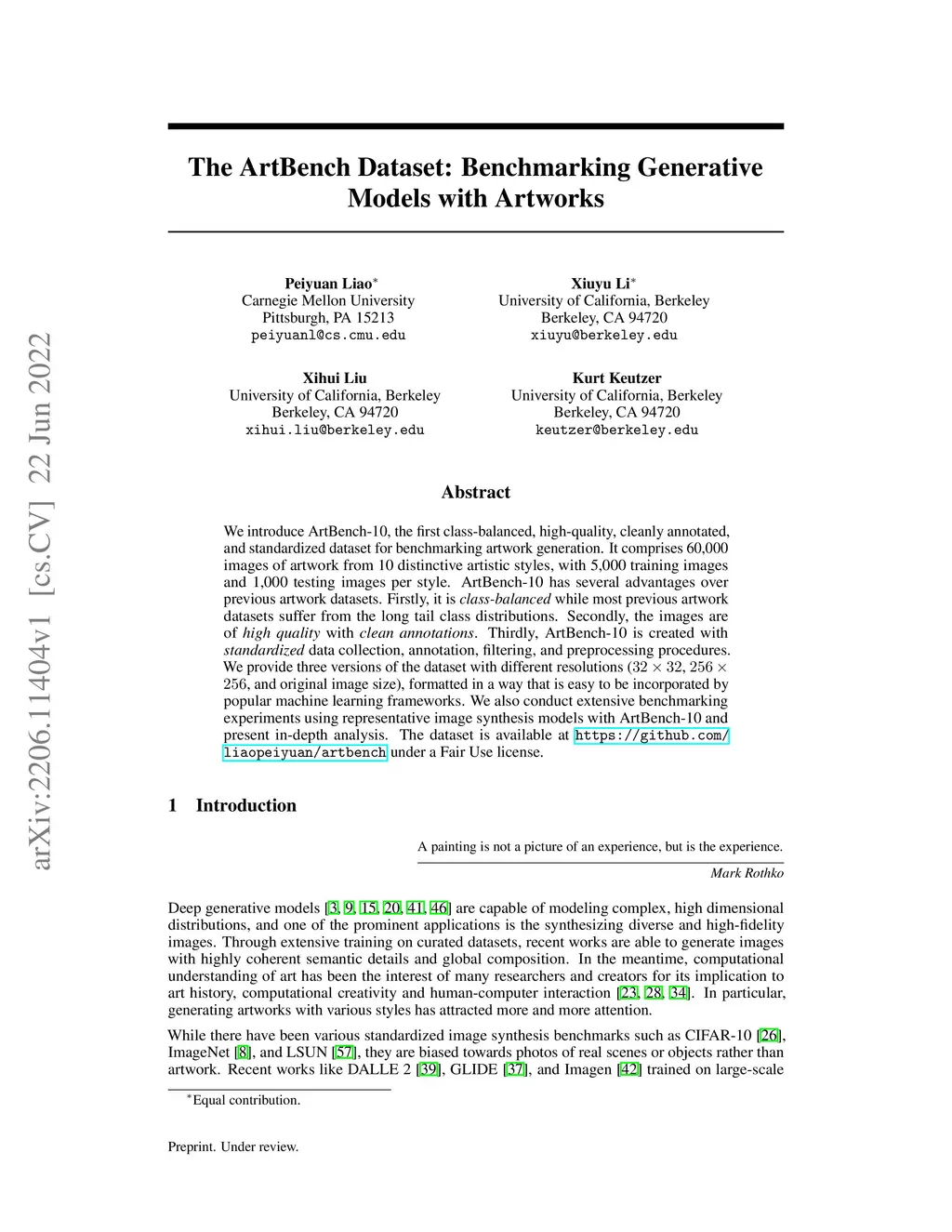 The ArtBench Dataset: Benchmarking Generative Models with Artworks