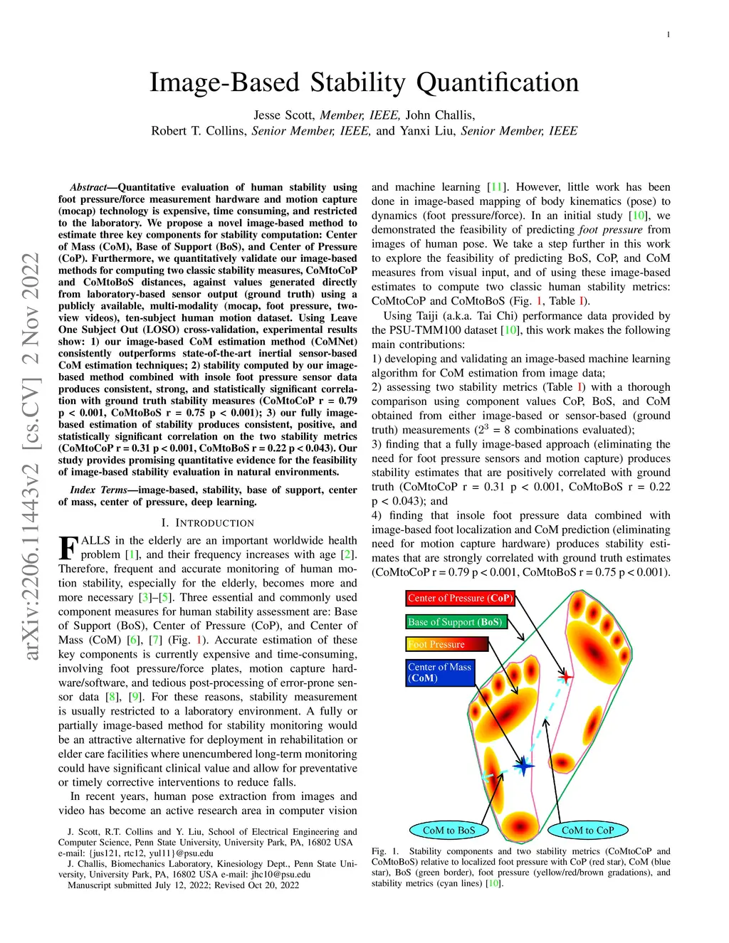 Quantitative evaluation of human stability using foot pressure/force measurement hardware and motion capture (mocap) technology is expensive, time consuming, and restricted to the laboratory. We propose a novel image-based method to estimate three key components for stability computation: Center of Mass (CoM), Base of Support (BoS), and Center of Pressure (CoP). Furthermore, we quantitatively validate our image-based methods for computing two classic stability measures, CoMtoCoP and CoMtoBoS distances, against values generated directly from laboratory-based sensor output (ground truth) using a publicly available, multi-modality (mocap, foot pressure, two-view videos), ten-subject human motion dataset. Using Leave One Subject Out (LOSO) cross-validation, experimental results show: 1) our image-based CoM estimation method (CoMNet) consistently outperforms state-of-the-art inertial sensor-based CoM estimation techniques; 2) stability computed by our image-based method combined with insole foot pressure sensor data produces consistent, strong, and statistically significant correlation with ground truth stability measures (CoMtoCoP r = 0.79 p < 0.001, CoMtoBoS r = 0.75 p < 0.001); 3) our fully image-based estimation of stability produces consistent, positive, and statistically significant correlation on the two stability metrics (CoMtoCoP r = 0.31 p < 0.001, CoMtoBoS r = 0.22 p < 0.043). Our study provides promising quantitative evidence for the feasibility of image-based stability evaluation in natural environments.