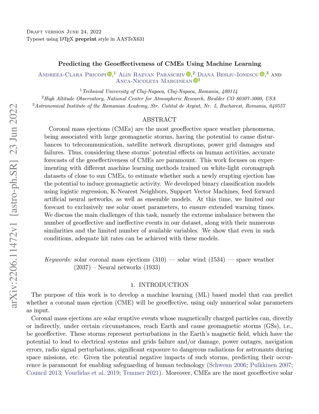 Coronal mass ejections (CMEs) are the most geoeffective space weather phenomena, being associated with large geomagnetic storms, having the potential to cause disturbances to telecommunication, satellite network disruptions, power grid damages and failures. Thus, considering these storms' potential effects on human activities, accurate forecasts of the geoeffectiveness of CMEs are paramount. This work focuses on experimenting with different machine learning methods trained on white-light coronagraph datasets of close to sun CMEs, to estimate whether such a newly erupting ejection has the potential to induce geomagnetic activity. We developed binary classification models using logistic regression, K-Nearest Neighbors, Support Vector Machines, feed forward artificial neural networks, as well as ensemble models. At this time, we limited our forecast to exclusively use solar onset parameters, to ensure extended warning times. We discuss the main challenges of this task, namely the extreme imbalance between the number of geoeffective and ineffective events in our dataset, along with their numerous similarities and the limited number of available variables. We show that even in such conditions, adequate hit rates can be achieved with these models.