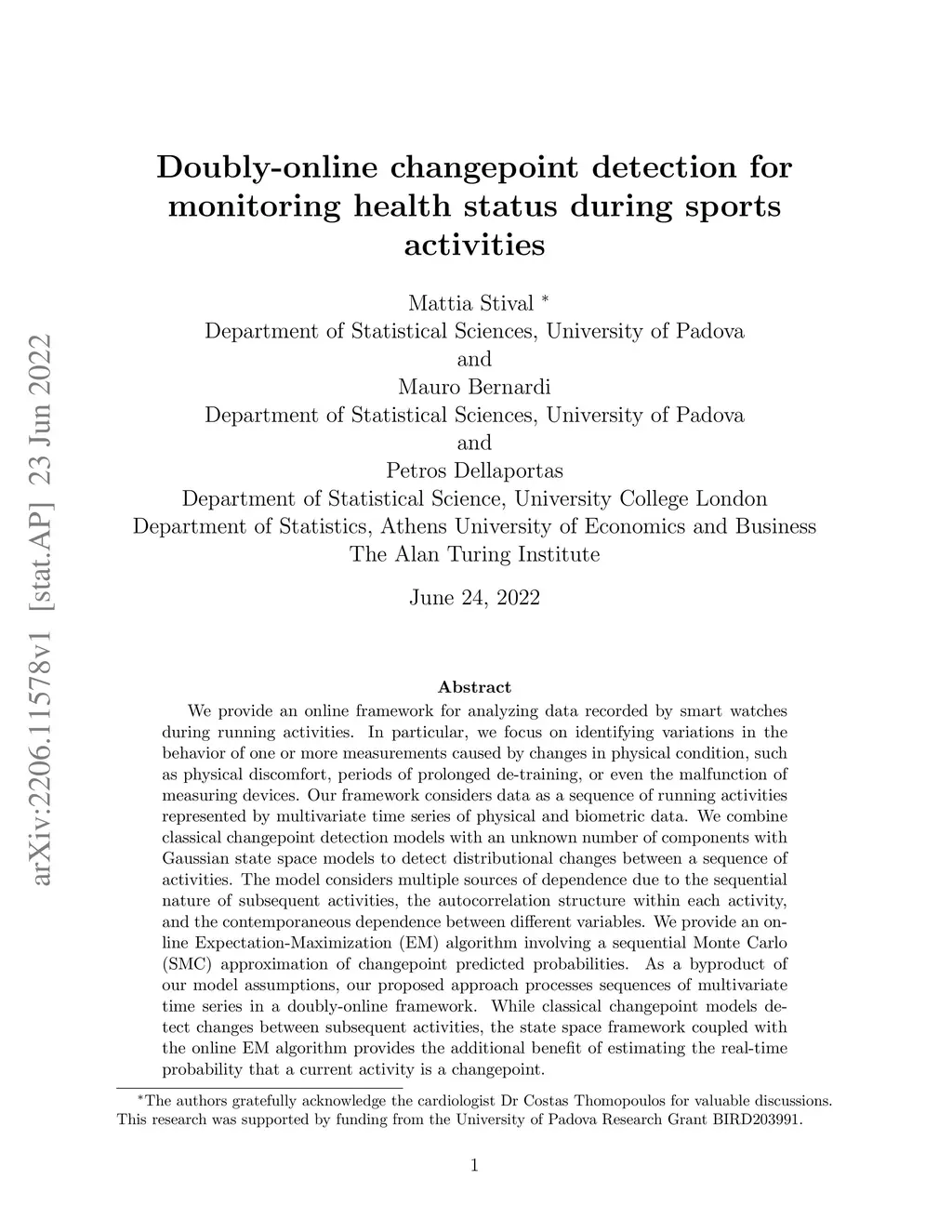 We provide an online framework for analyzing data recorded by smart watches during running activities. In particular, we focus on identifying variations in the behavior of one or more measurements caused by changes in physical condition, such as physical discomfort, periods of prolonged de-training, or even the malfunction of measuring devices. Our framework considers data as a sequence of running activities represented by multivariate time series of physical and biometric data. We combine classical changepoint detection models with an unknown number of components with Gaussian state space models to detect distributional changes between a sequence of activities. The model considers multiple sources of dependence due to the sequential nature of subsequent activities, the autocorrelation structure within each activity, and the contemporaneous dependence between different variables. We provide an online Expectation-Maximization (EM) algorithm involving a sequential Monte Carlo (SMC) approximation of changepoint predicted probabilities. As a byproduct of our model assumptions, our proposed approach processes sequences of multivariate time series in a doubly-online framework. While classical changepoint models detect changes between subsequent activities, the state space framework coupled with the online EM algorithm provides the additional benefit of estimating the real-time probability that a current activity is a changepoint.