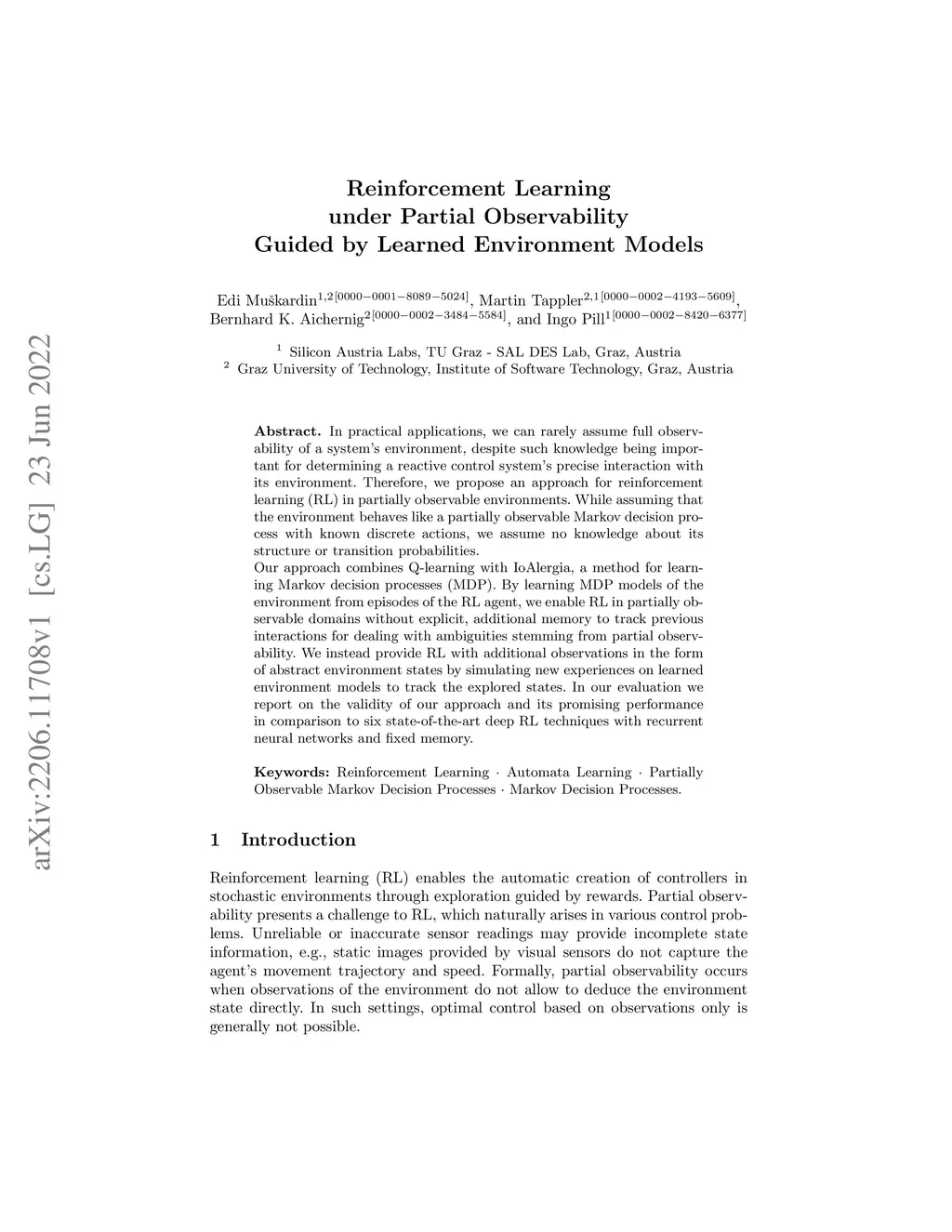 In practical applications, we can rarely assume full observability of a system's environment, despite such knowledge being important for determining a reactive control system's precise interaction with its environment. Therefore, we propose an approach for reinforcement learning (RL) in partially observable environments. While assuming that the environment behaves like a partially observable Markov decision process with known discrete actions, we assume no knowledge about its structure or transition probabilities. Our approach combines Q-learning with IoAlergia, a method for learning Markov decision processes (MDP). By learning MDP models of the environment from episodes of the RL agent, we enable RL in partially observable domains without explicit, additional memory to track previous interactions for dealing with ambiguities stemming from partial observability. We instead provide RL with additional observations in the form of abstract environment states by simulating new experiences on learned environment models to track the explored states. In our evaluation, we report on the validity of our approach and its promising performance in comparison to six state-of-the-art deep RL techniques with recurrent neural networks and fixed memory.