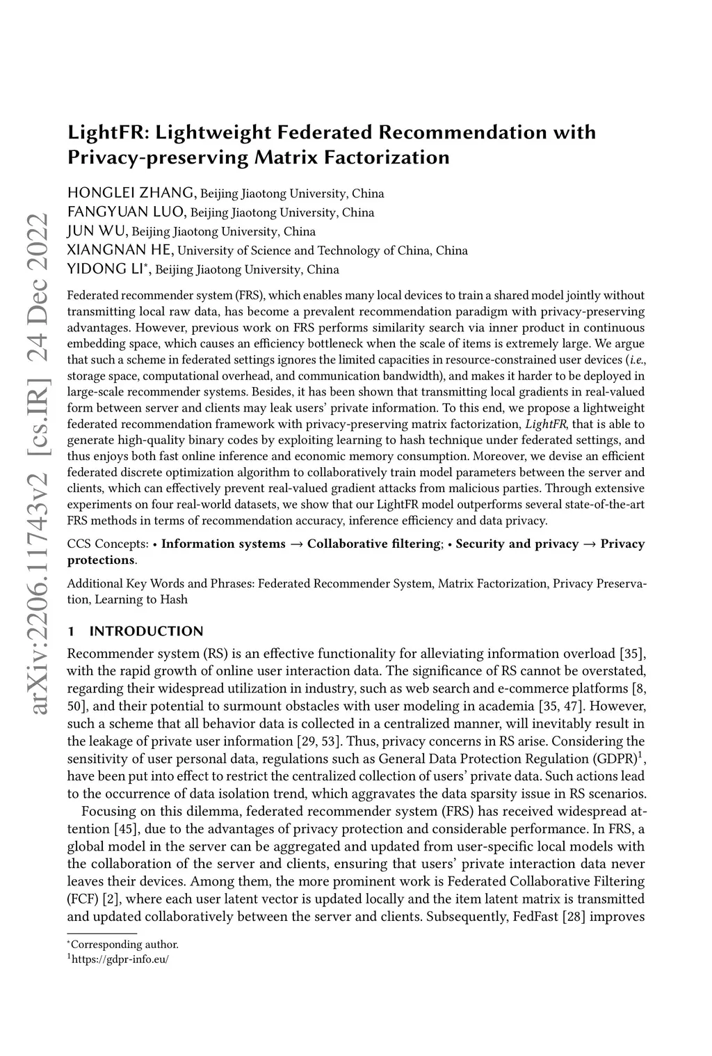 LightFR: Lightweight Federated Recommendation with Privacy-preserving