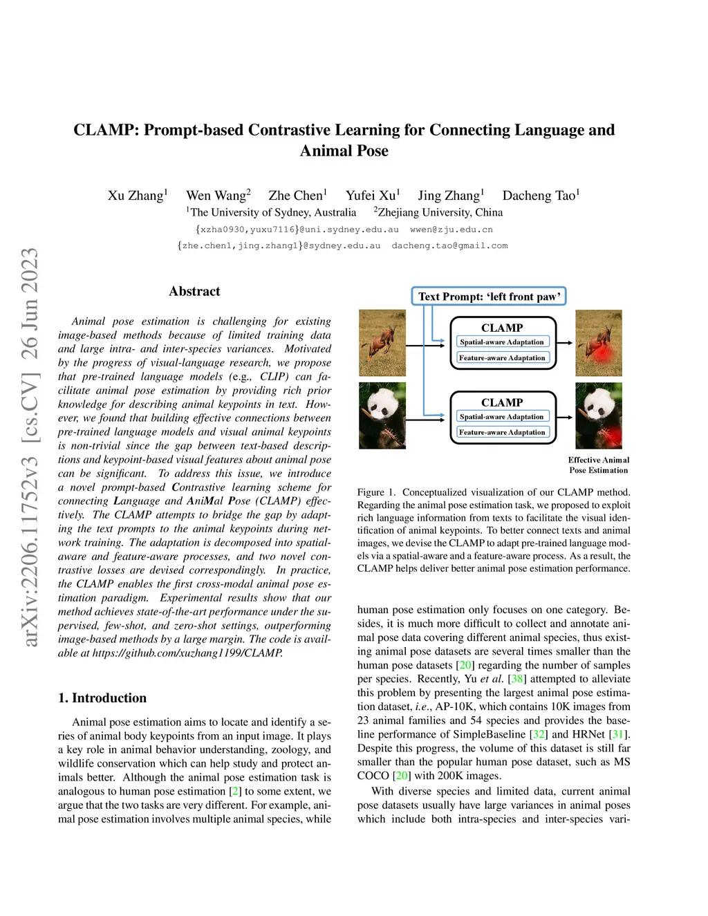 Animal pose estimation is challenging for existing image-based methods because of limited training data and large intra- and inter-species variances. Motivated by the progress of visual-language research, we propose that pre-trained language models (e.g., CLIP) can facilitate animal pose estimation by providing rich prior knowledge for describing animal keypoints in text. However, we found that building effective connections between pre-trained language models and visual animal keypoints is non-trivial since the gap between text-based descriptions and keypoint-based visual features about animal pose can be significant. To address this issue, we introduce a novel prompt-based Contrastive learning scheme for connecting Language and AniMal Pose (CLAMP) effectively. The CLAMP attempts to bridge the gap by adapting the text prompts to the animal keypoints during network training. The adaptation is decomposed into spatial-aware and feature-aware processes, and two novel contrastive losses are devised correspondingly. In practice, the CLAMP enables the first cross-modal animal pose estimation paradigm. Experimental results show that our method achieves state-of-the-art performance under the supervised, few-shot, and zero-shot settings, outperforming image-based methods by a large margin.
