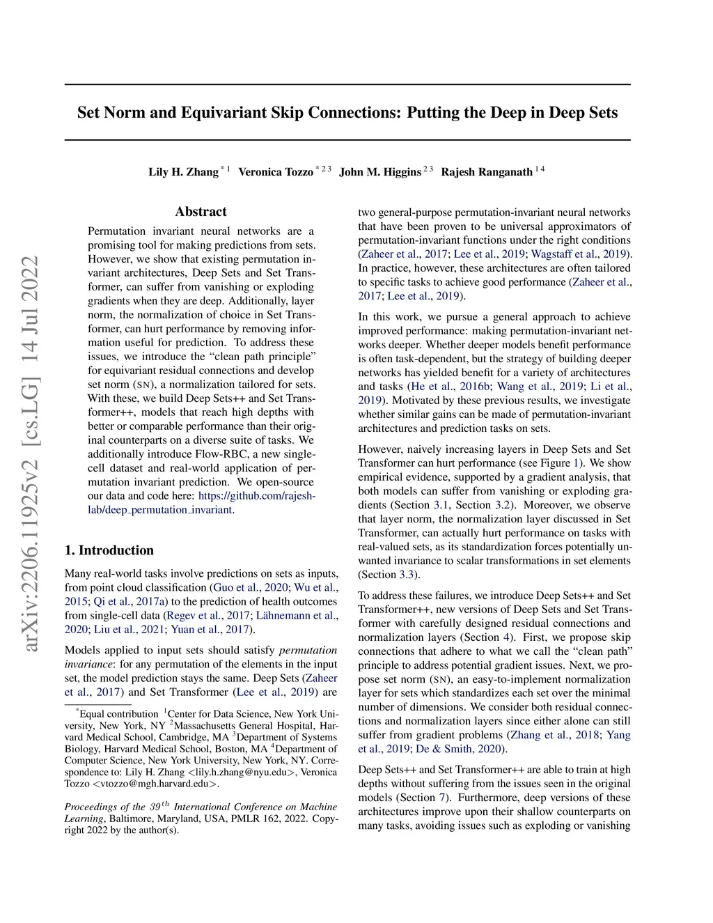 Permutation invariant neural networks are a promising tool for making predictions from sets. However, we show that existing permutation invariant architectures, Deep Sets and Set Transformer, can suffer from vanishing or exploding gradients when they are deep. Additionally, layer norm, the normalization of choice in Set Transformer, can hurt performance by removing information useful for prediction. To address these issues, we introduce the clean path principle for equivariant residual connections and develop set norm, a normalization tailored for sets. With these, we build Deep Sets++ and Set Transformer++, models that reach high depths with comparable or better performance than their original counterparts on a diverse suite of tasks. We additionally introduce Flow-RBC, a new single-cell dataset and real-world application of permutation invariant prediction. We open-source our data and code here: https://github.com/rajesh-lab/deep_permutation_invariant.