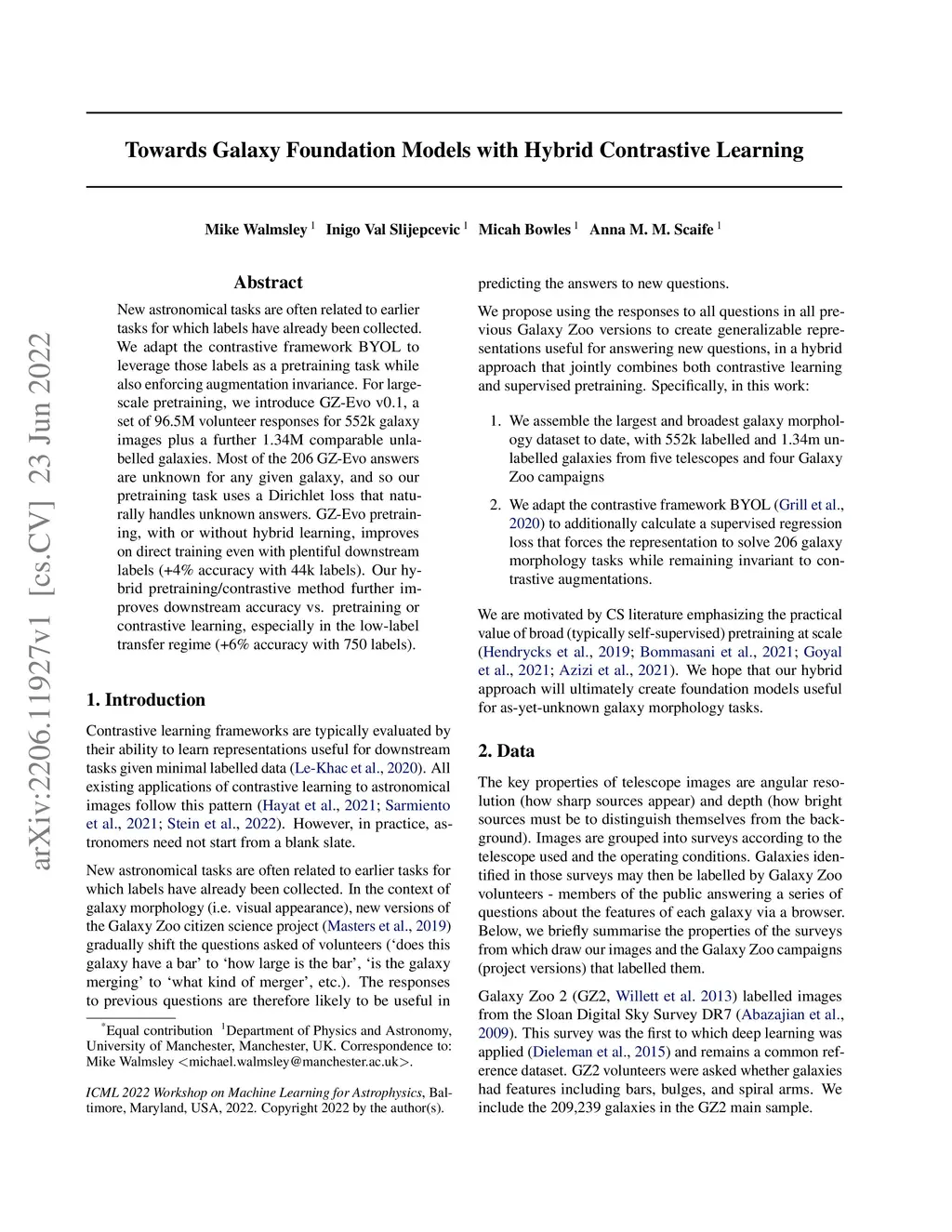New astronomical tasks are often related to earlier tasks for which labels have already been collected. We adapt the contrastive framework BYOL to leverage those labels as a pretraining task while also enforcing augmentation invariance. For large-scale pretraining, we introduce GZ-Evo v0.1, a set of 96.5M volunteer responses for 552k galaxy images plus a further 1.34M comparable unlabelled galaxies. Most of the 206 GZ-Evo answers are unknown for any given galaxy, and so our pretraining task uses a Dirichlet loss that naturally handles unknown answers. GZ-Evo pretraining, with or without hybrid learning, improves on direct training even with plentiful downstream labels (+4% accuracy with 44k labels). Our hybrid pretraining/contrastive method further improves downstream accuracy vs. pretraining or contrastive learning, especially in the low-label transfer regime (+6% accuracy with 750 labels).