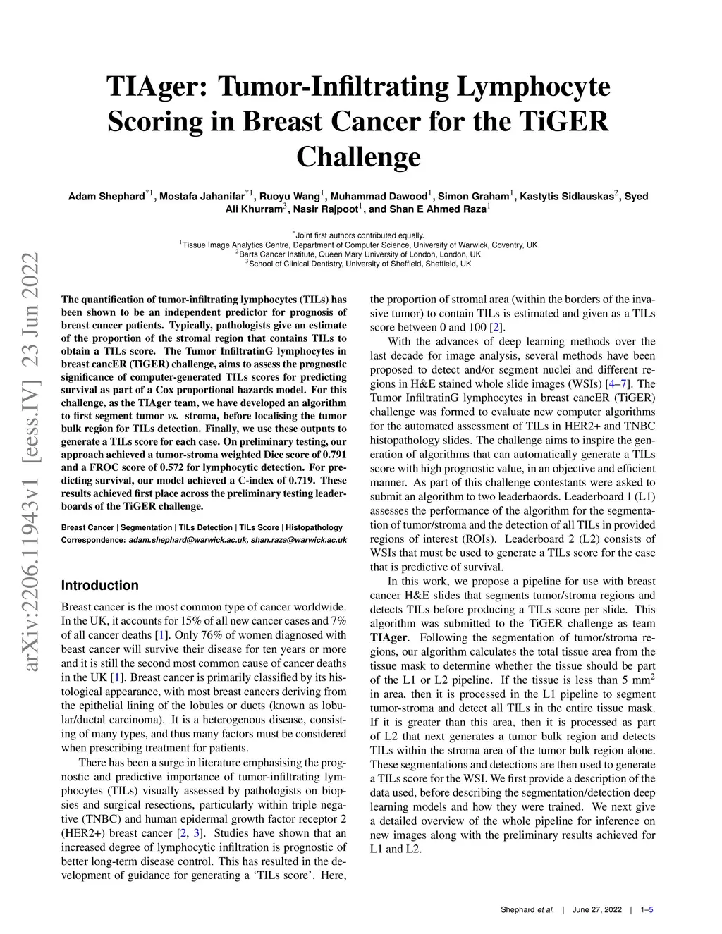 The quantification of tumor-infiltrating lymphocytes (TILs) has been shown to be an independent predictor for prognosis of breast cancer patients. Typically, pathologists give an estimate of the proportion of the stromal region that contains TILs to obtain a TILs score. The Tumor InfiltratinG lymphocytes in breast cancER (TiGER) challenge, aims to assess the prognostic significance of computer-generated TILs scores for predicting survival as part of a Cox proportional hazards model. For this challenge, as the TIAger team, we have developed an algorithm to first segment tumor vs. stroma, before localising the tumor bulk region for TILs detection. Finally, we use these outputs to generate a TILs score for each case. On preliminary testing, our approach achieved a tumor-stroma weighted Dice score of 0.791 and a FROC score of 0.572 for lymphocytic detection. For predicting survival, our model achieved a C-index of 0.719. These results achieved first place across the preliminary testing leaderboards of the TiGER challenge.