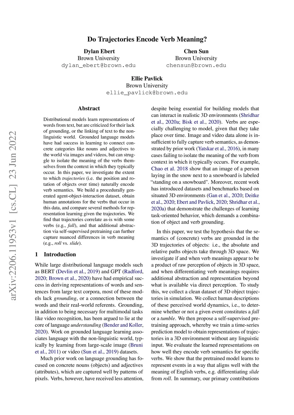 Distributional models learn representations of words from text, but are criticized for their lack of grounding, or the linking of text to the non-linguistic world. Grounded language models have had success in learning to connect concrete categories like nouns and adjectives to the world via images and videos, but can struggle to isolate the meaning of the verbs themselves from the context in which they typically occur. In this paper, we investigate the extent to which trajectories (i.e. the position and rotation of objects over time) naturally encode verb semantics. We build a procedurally generated agent-object-interaction dataset, obtain human annotations for the verbs that occur in this data, and compare several methods for representation learning given the trajectories. We find that trajectories correlate as-is with some verbs (e.g., fall), and that additional abstraction via self-supervised pretraining can further capture nuanced differences in verb meaning (e.g., roll vs. slide).