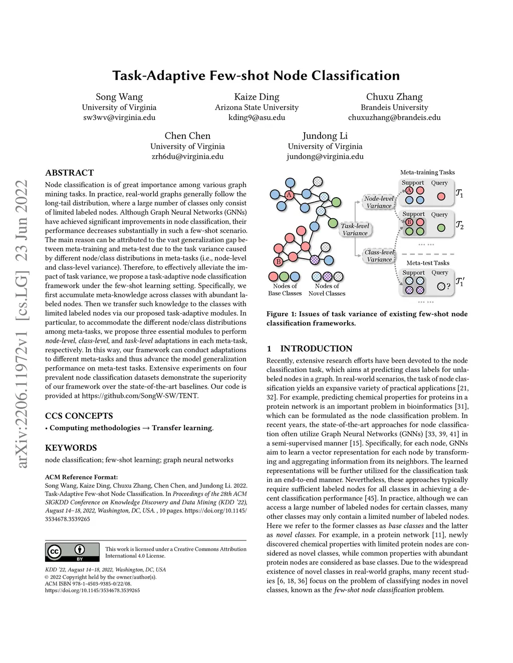 Node classification is of great importance among various graph mining tasks. In practice, real-world graphs generally follow the long-tail distribution, where a large number of classes only consist of limited labeled nodes. Although Graph Neural Networks (GNNs) have achieved significant improvements in node classification, their performance decreases substantially in such a few-shot scenario. The main reason can be attributed to the vast generalization gap between meta-training and meta-test due to the task variance caused by different node/class distributions in meta-tasks (i.e., node-level and class-level variance). Therefore, to effectively alleviate the impact of task variance, we propose a task-adaptive node classification framework under the few-shot learning setting. Specifically, we first accumulate meta-knowledge across classes with abundant labeled nodes. Then we transfer such knowledge to the classes with limited labeled nodes via our proposed task-adaptive modules. In particular, to accommodate the different node/class distributions among meta-tasks, we propose three essential modules to perform \emph{node-level}, \emph{class-level}, and \emph{task-level} adaptations in each meta-task, respectively. In this way, our framework can conduct adaptations to different meta-tasks and thus advance the model generalization performance on meta-test tasks. Extensive experiments on four prevalent node classification datasets demonstrate the superiority of our framework over the state-of-the-art baselines. Our code is provided at https://github.com/SongW-SW/TENT.