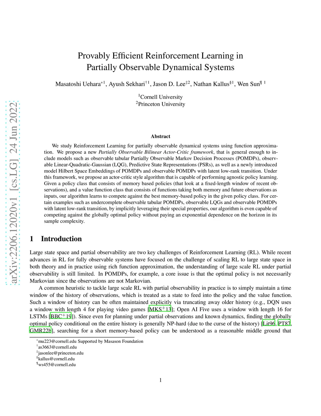 We study Reinforcement Learning for partially observable dynamical systems using function approximation. We propose a new \textit{Partially Observable Bilinear Actor-Critic framework}, that is general enough to include models such as observable tabular Partially Observable Markov Decision Processes (POMDPs), observable Linear-Quadratic-Gaussian (LQG), Predictive State Representations (PSRs), as well as a newly introduced model Hilbert Space Embeddings of POMDPs and observable POMDPs with latent low-rank transition. Under this framework, we propose an actor-critic style algorithm that is capable of performing agnostic policy learning. Given a policy class that consists of memory based policies (that look at a fixed-length window of recent observations), and a value function class that consists of functions taking both memory and future observations as inputs, our algorithm learns to compete against the best memory-based policy in the given policy class. For certain examples such as undercomplete observable tabular POMDPs, observable LQGs and observable POMDPs with latent low-rank transition, by implicitly leveraging their special properties, our algorithm is even capable of competing against the globally optimal policy without paying an exponential dependence on the horizon in its sample complexity.