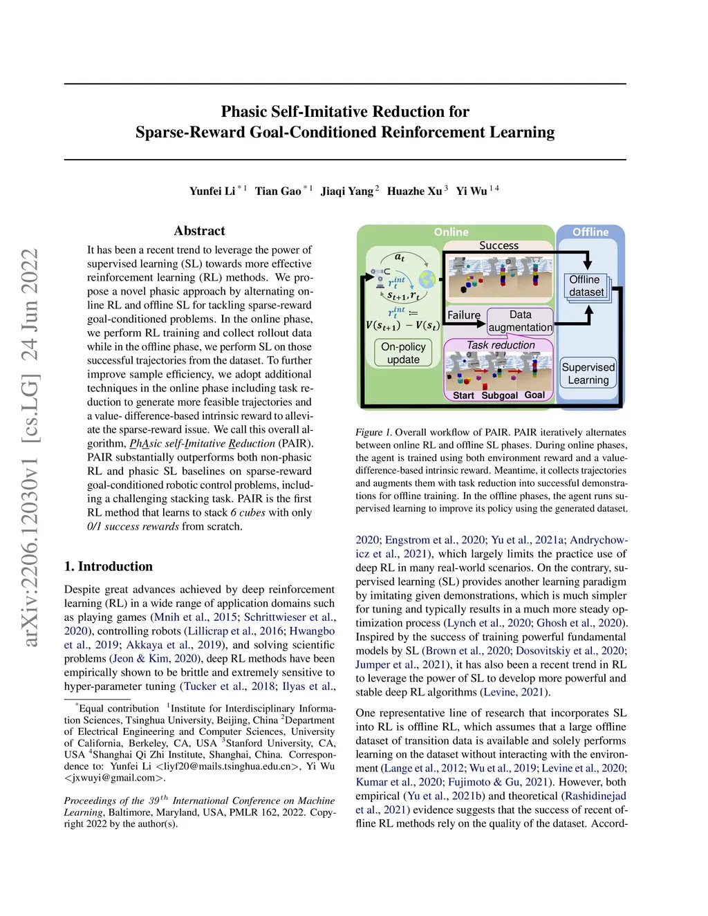 It has been a recent trend to leverage the power of supervised learning (SL) towards more effective reinforcement learning (RL) methods. We propose a novel phasic approach by alternating online RL and offline SL for tackling sparse-reward goal-conditioned problems. In the online phase, we perform RL training and collect rollout data while in the offline phase, we perform SL on those successful trajectories from the dataset. To further improve sample efficiency, we adopt additional techniques in the online phase including task reduction to generate more feasible trajectories and a value-difference-based intrinsic reward to alleviate the sparse-reward issue. We call this overall algorithm, PhAsic self-Imitative Reduction (PAIR). PAIR substantially outperforms both non-phasic RL and phasic SL baselines on sparse-reward goal-conditioned robotic control problems, including a challenging stacking task. PAIR is the first RL method that learns to stack 6 cubes with only 0/1 success rewards from scratch.