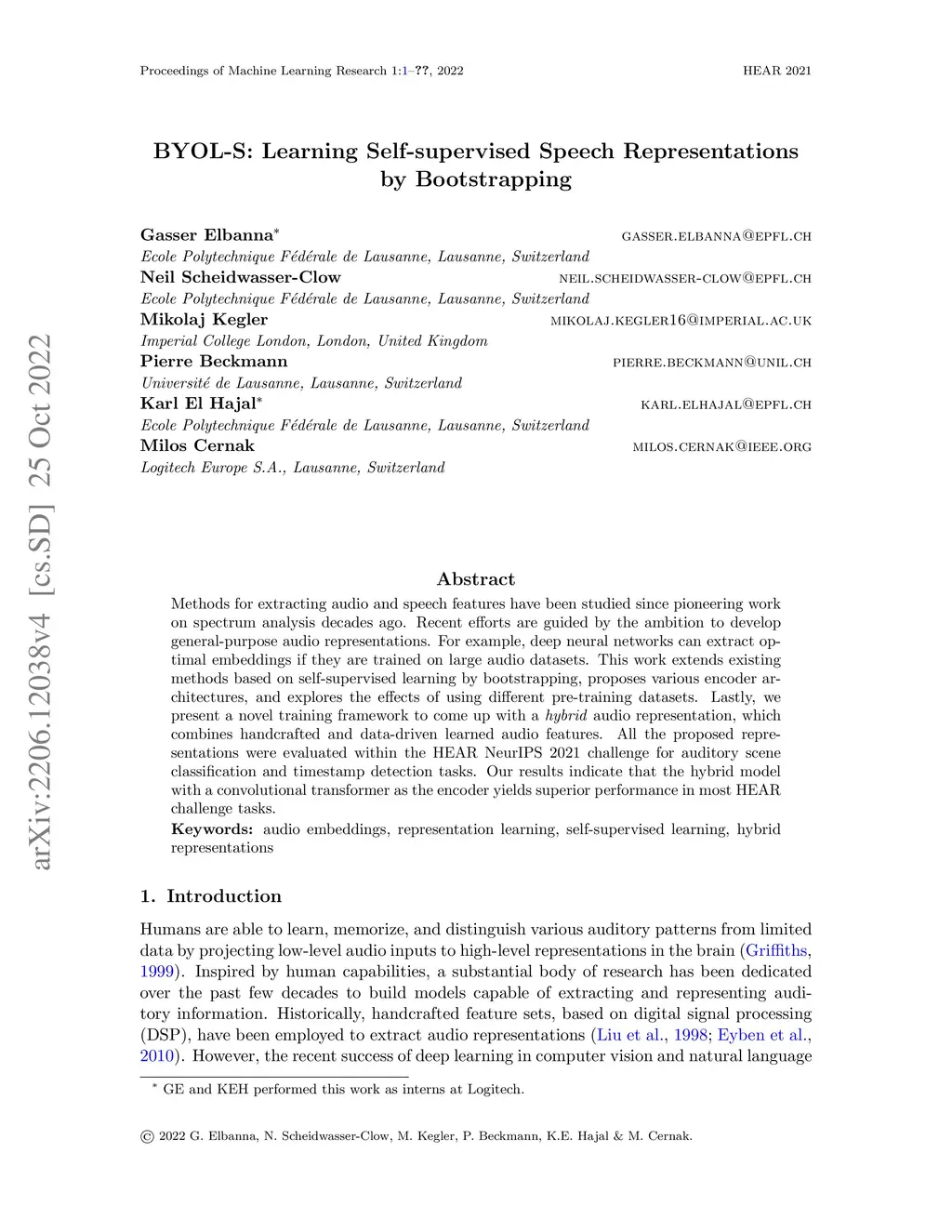 Methods for extracting audio and speech features have been studied since pioneering work on spectrum analysis decades ago. Recent efforts are guided by the ambition to develop general-purpose audio representations. For example, deep neural networks can extract optimal embeddings if they are trained on large audio datasets. This work extends existing methods based on self-supervised learning by bootstrapping, proposes various encoder architectures, and explores the effects of using different pre-training datasets. Lastly, we present a novel training framework to come up with a hybrid audio representation, which combines handcrafted and data-driven learned audio features. All the proposed representations were evaluated within the HEAR NeurIPS 2021 challenge for auditory scene classification and timestamp detection tasks. Our results indicate that the hybrid model with a convolutional transformer as the encoder yields superior performance in most HEAR challenge tasks.