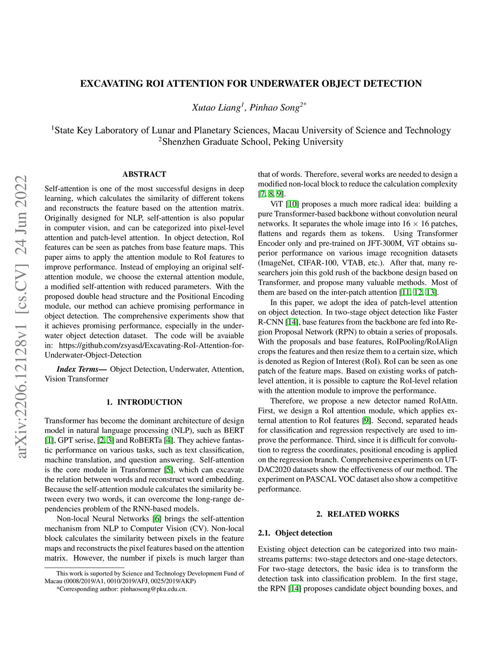 Self-attention is one of the most successful designs in deep learning, which calculates the similarity of different tokens and reconstructs the feature based on the attention matrix. Originally designed for NLP, self-attention is also popular in computer vision, and can be categorized into pixel-level attention and patch-level attention. In object detection, RoI features can be seen as patches from base feature maps. This paper aims to apply the attention module to RoI features to improve performance. Instead of employing an original self-attention module, we choose the external attention module, a modified self-attention with reduced parameters. With the proposed double head structure and the Positional Encoding module, our method can achieve promising performance in object detection. The comprehensive experiments show that it achieves promising performance, especially in the underwater object detection dataset. The code will be avaiable in: https://github.com/zsyasd/Excavating-RoI-Attention-for-Underwater-Object-Detection