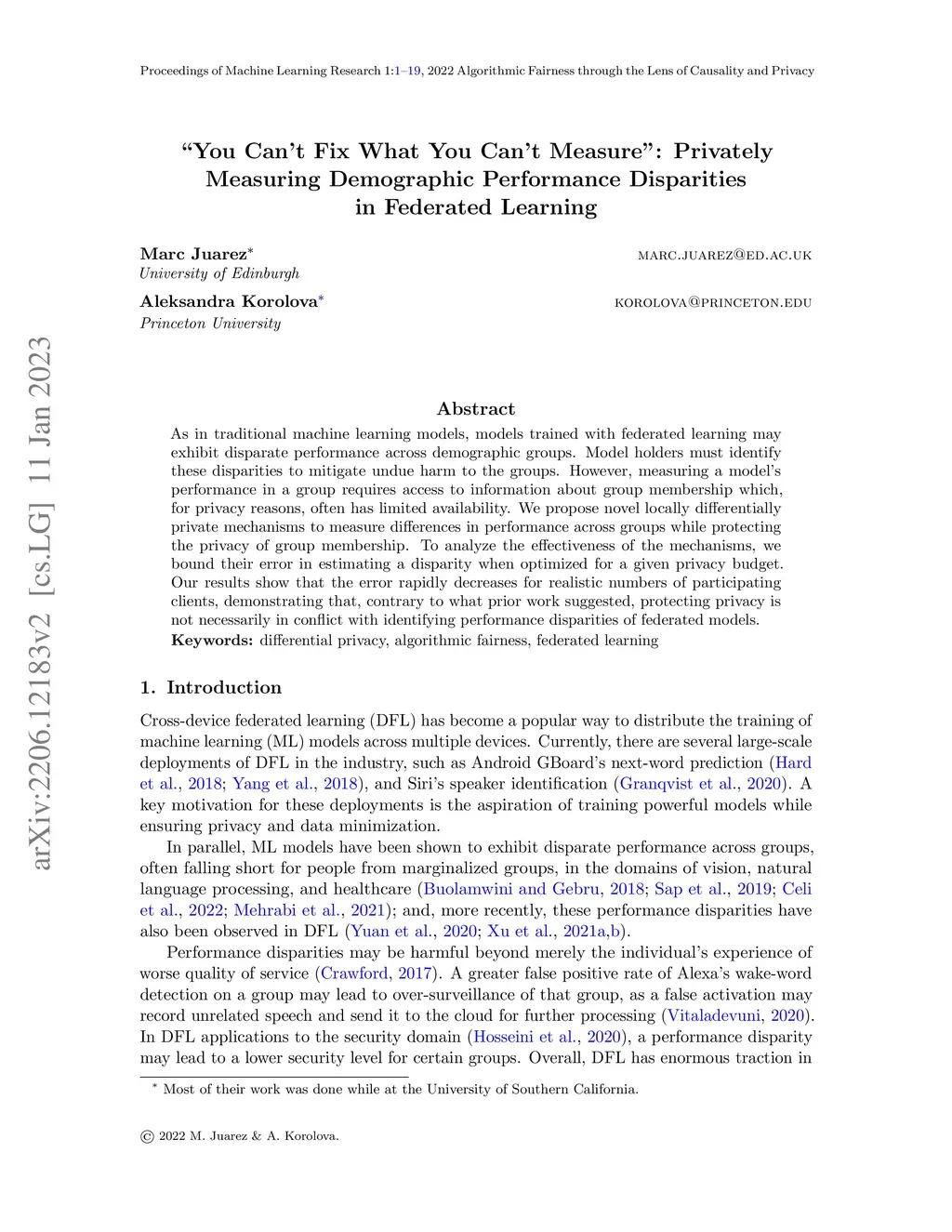 As in traditional machine learning models, models trained with federated learning may exhibit disparate performance across demographic groups. Model holders must identify these disparities to mitigate undue harm to the groups. However, measuring a model's performance in a group requires access to information about group membership which, for privacy reasons, often has limited availability. We propose novel locally differentially private mechanisms to measure differences in performance across groups while protecting the privacy of group membership. To analyze the effectiveness of the mechanisms, we bound their error in estimating a disparity when optimized for a given privacy budget. Our results show that the error rapidly decreases for realistic numbers of participating clients, demonstrating that, contrary to what prior work suggested, protecting privacy is not necessarily in conflict with identifying performance disparities of federated models.