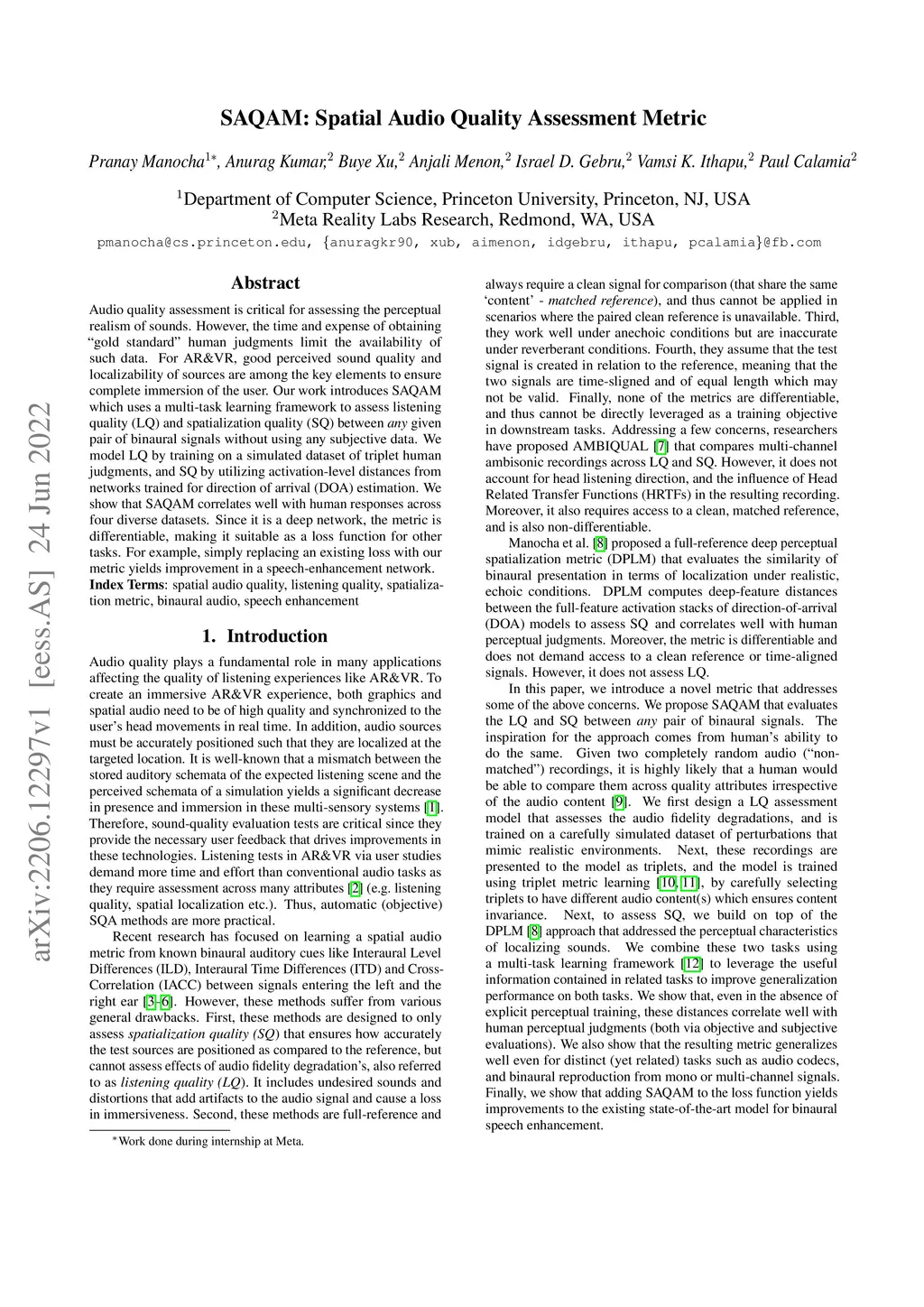 Audio quality assessment is critical for assessing the perceptual realism of sounds. However, the time and expense of obtaining ''gold standard'' human judgments limit the availability of such data. For AR&VR, good perceived sound quality and localizability of sources are among the key elements to ensure complete immersion of the user. Our work introduces SAQAM which uses a multi-task learning framework to assess listening quality (LQ) and spatialization quality (SQ) between any given pair of binaural signals without using any subjective data. We model LQ by training on a simulated dataset of triplet human judgments, and SQ by utilizing activation-level distances from networks trained for direction of arrival (DOA) estimation. We show that SAQAM correlates well with human responses across four diverse datasets. Since it is a deep network, the metric is differentiable, making it suitable as a loss function for other tasks. For example, simply replacing an existing loss with our metric yields improvement in a speech-enhancement network.