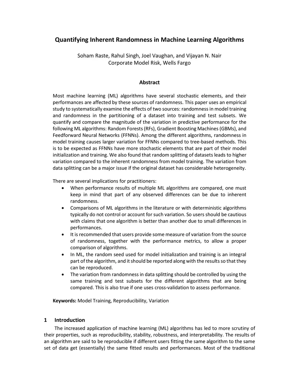 Most machine learning (ML) algorithms have several stochastic elements, and their performances are affected by these sources of randomness. This paper uses an empirical study to systematically examine the effects of two sources: randomness in model training and randomness in the partitioning of a dataset into training and test subsets. We quantify and compare the magnitude of the variation in predictive performance for the following ML algorithms: Random Forests (RFs), Gradient Boosting Machines (GBMs), and Feedforward Neural Networks (FFNNs). Among the different algorithms, randomness in model training causes larger variation for FFNNs compared to tree-based methods. This is to be expected as FFNNs have more stochastic elements that are part of their model initialization and training. We also found that random splitting of datasets leads to higher variation compared to the inherent randomness from model training. The variation from data splitting can be a major issue if the original dataset has considerable heterogeneity. Keywords: Model Training, Reproducibility, Variation