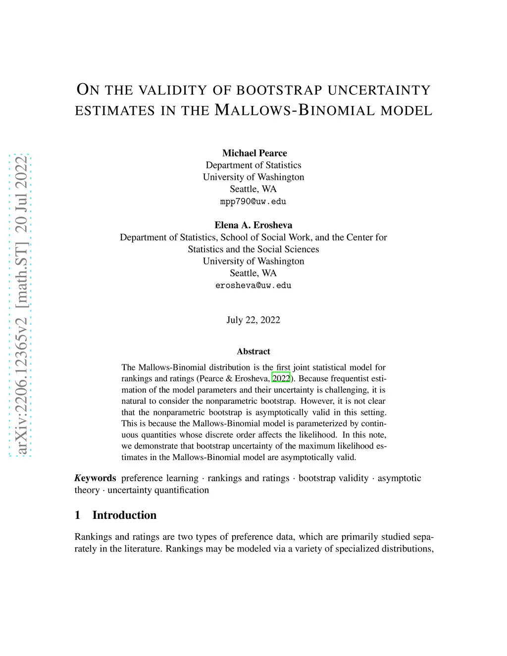 The Mallows-Binomial distribution is the first joint statistical model for rankings and ratings (Pearce and Erosheva, 2022). Because frequentist estimation of the model parameters and their uncertainty is challenging, it is natural to consider the nonparametric bootstrap. However, it is not clear that the nonparametric bootstrap is asymptotically valid in this setting. This is because the Mallows-Binomial model is parameterized by continuous quantities whose discrete order affects the likelihood. In this note, we demonstrate that bootstrap uncertainty of the maximum likelihood estimates in the Mallows-Binomial model are asymptotically valid.