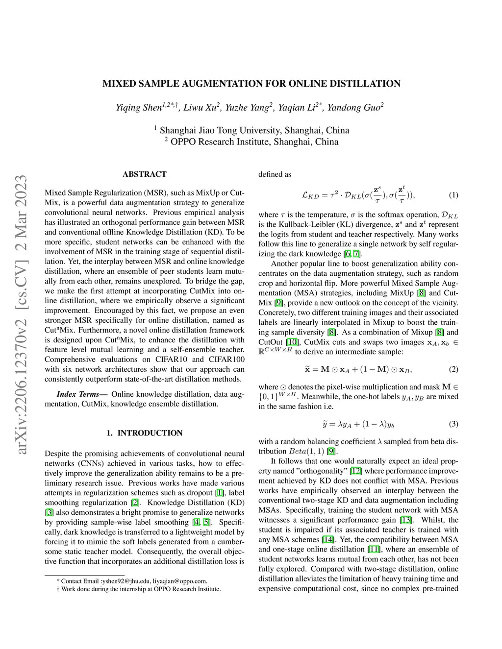 Mixed Sample Augmentation for Online Distillation