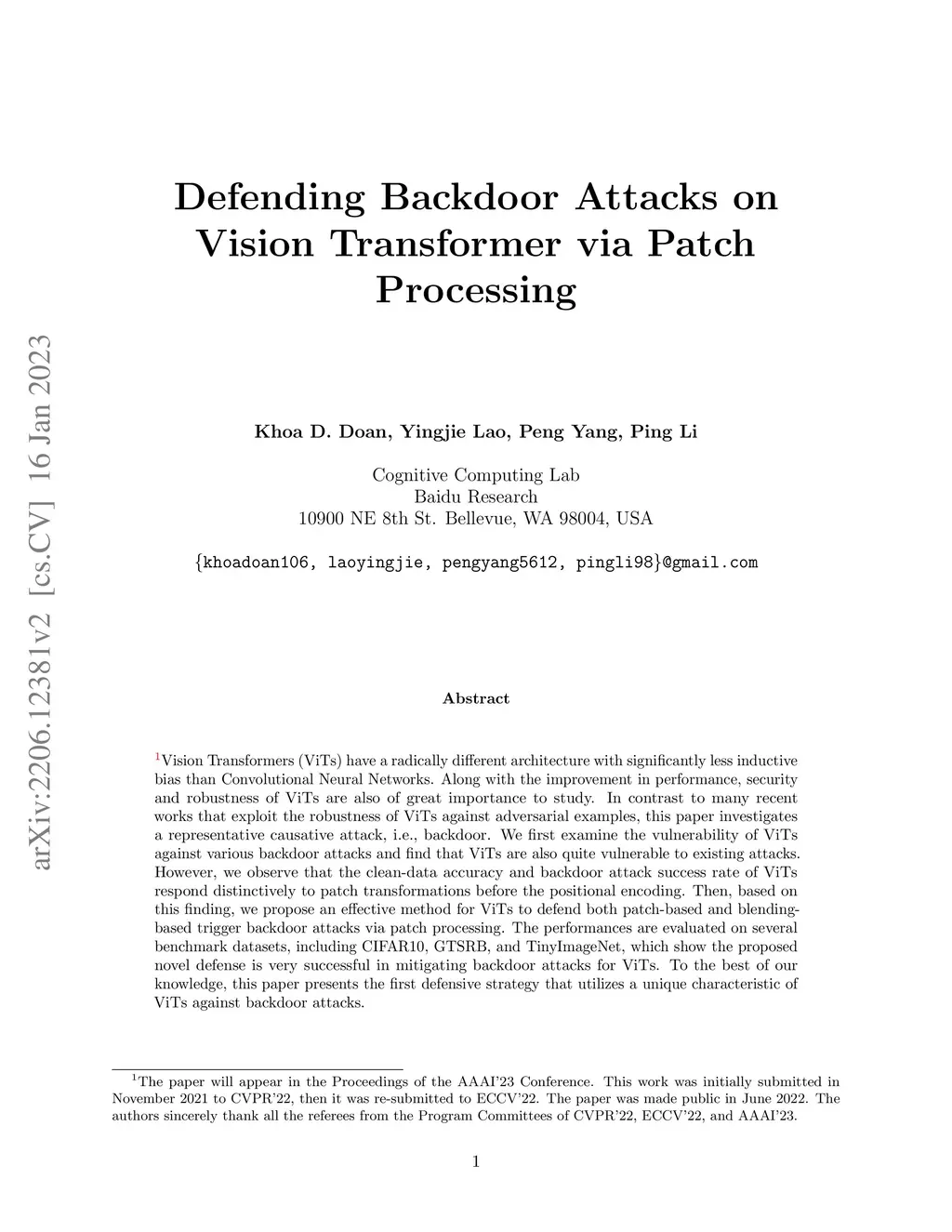Defending Backdoor Attacks on Vision Transformer via Patch Processing