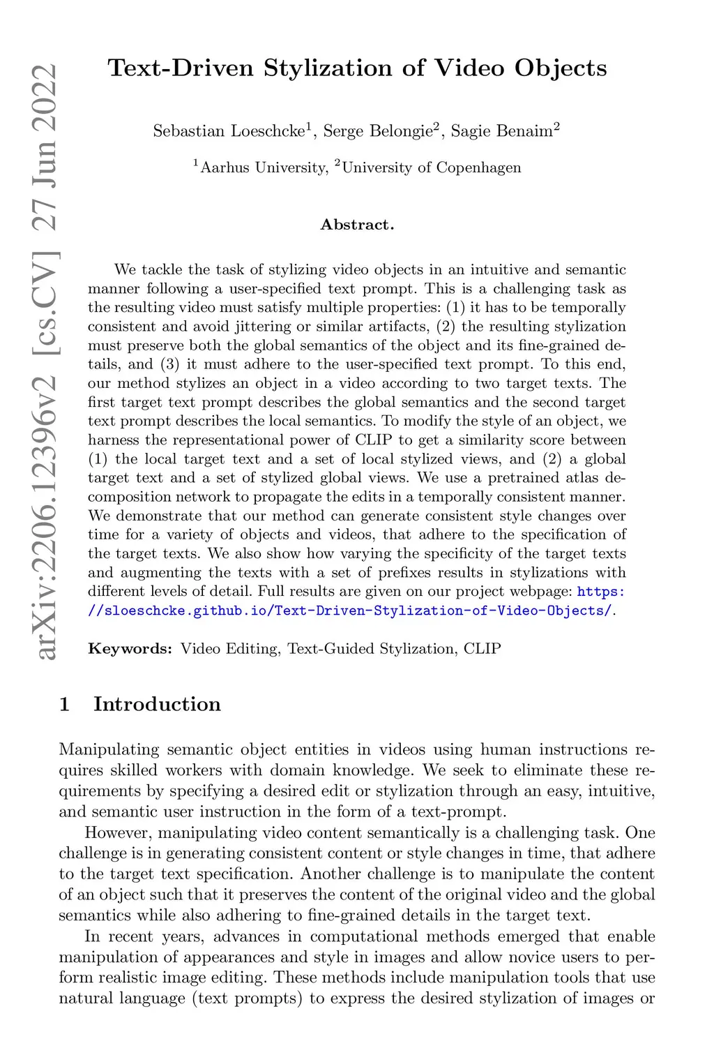 We tackle the task of stylizing video objects in an intuitive and semantic manner following a user-specified text prompt. This is a challenging task as the resulting video must satisfy multiple properties: (1) it has to be temporally consistent and avoid jittering or similar artifacts, (2) the resulting stylization must preserve both the global semantics of the object and its fine-grained details, and (3) it must adhere to the user-specified text prompt. To this end, our method stylizes an object in a video according to two target texts. The first target text prompt describes the global semantics and the second target text prompt describes the local semantics. To modify the style of an object, we harness the representational power of CLIP to get a similarity score between (1) the local target text and a set of local stylized views, and (2) a global target text and a set of stylized global views. We use a pretrained atlas decomposition network to propagate the edits in a temporally consistent manner. We demonstrate that our method can generate consistent style changes over time for a variety of objects and videos, that adhere to the specification of the target texts. We also show how varying the specificity of the target texts and augmenting the texts with a set of prefixes results in stylizations with different levels of detail. Full results are given on our project webpage: https://sloeschcke.github.io/Text-Driven-Stylization-of-Video-Objects/