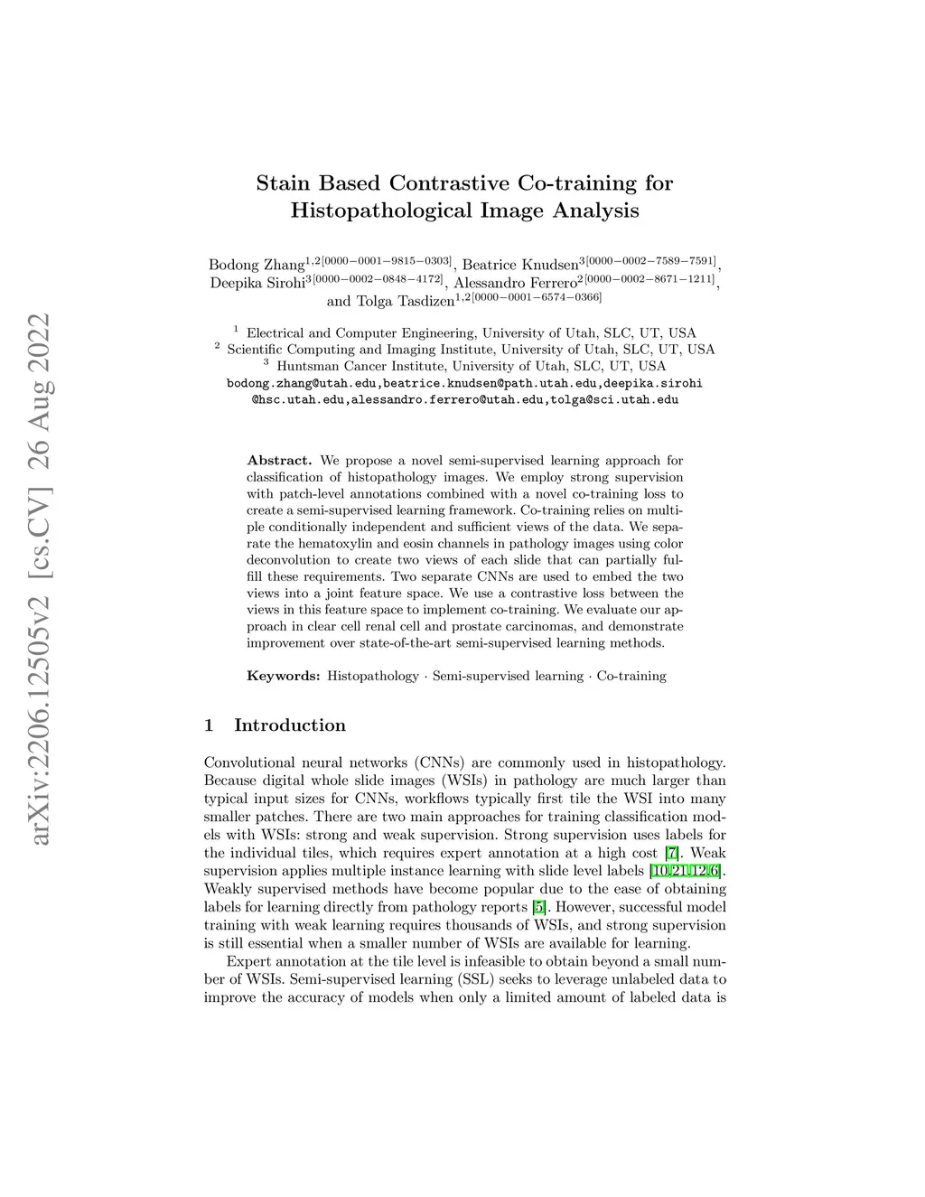 We propose a novel semi-supervised learning approach for classification of histopathology images. We employ strong supervision with patch-level annotations combined with a novel co-training loss to create a semi-supervised learning framework. Co-training relies on multiple conditionally independent and sufficient views of the data. We separate the hematoxylin and eosin channels in pathology images using color deconvolution to create two views of each slide that can partially fulfill these requirements. Two separate CNNs are used to embed the two views into a joint feature space. We use a contrastive loss between the views in this feature space to implement co-training. We evaluate our approach in clear cell renal cell and prostate carcinomas, and demonstrate improvement over state-of-the-art semi-supervised learning methods.