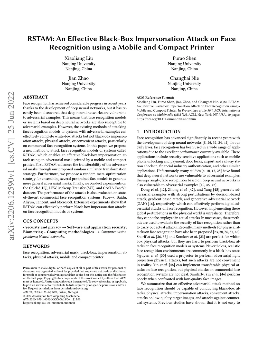 Face recognition has achieved considerable progress in recent years thanks to the development of deep neural networks, but it has recently been discovered that deep neural networks are vulnerable to adversarial examples. This means that face recognition models or systems based on deep neural networks are also susceptible to adversarial examples. However, the existing methods of attacking face recognition models or systems with adversarial examples can effectively complete white-box attacks but not black-box impersonation attacks, physical attacks, or convenient attacks, particularly on commercial face recognition systems. In this paper, we propose a new method to attack face recognition models or systems called RSTAM, which enables an effective black-box impersonation attack using an adversarial mask printed by a mobile and compact printer. First, RSTAM enhances the transferability of the adversarial masks through our proposed random similarity transformation strategy. Furthermore, we propose a random meta-optimization strategy for ensembling several pre-trained face models to generate more general adversarial masks. Finally, we conduct experiments on the CelebA-HQ, LFW, Makeup Transfer (MT), and CASIA-FaceV5 datasets. The performance of the attacks is also evaluated on state-of-the-art commercial face recognition systems: Face++, Baidu, Aliyun, Tencent, and Microsoft. Extensive experiments show that RSTAM can effectively perform black-box impersonation attacks on face recognition models or systems.