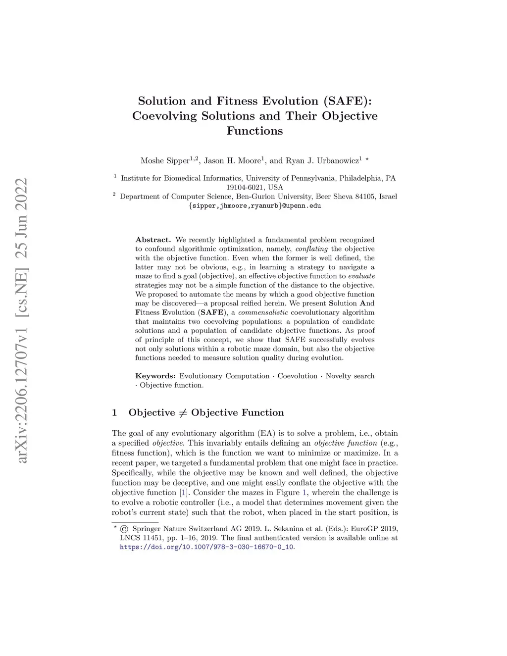 We recently highlighted a fundamental problem recognized to confound algorithmic optimization, namely, \textit{conflating} the objective with the objective function. Even when the former is well defined, the latter may not be obvious, e.g., in learning a strategy to navigate a maze to find a goal (objective), an effective objective function to \textit{evaluate} strategies may not be a simple function of the distance to the objective. We proposed to automate the means by which a good objective function may be discovered -- a proposal reified herein. We present \textbf{S}olution \textbf{A}nd \textbf{F}itness \textbf{E}volution (\textbf{SAFE}), a \textit{commensalistic} coevolutionary algorithm that maintains two coevolving populations: a population of candidate solutions and a population of candidate objective functions. As proof of principle of this concept, we show that SAFE successfully evolves not only solutions within a robotic maze domain, but also the objective functions needed to measure solution quality during evolution.