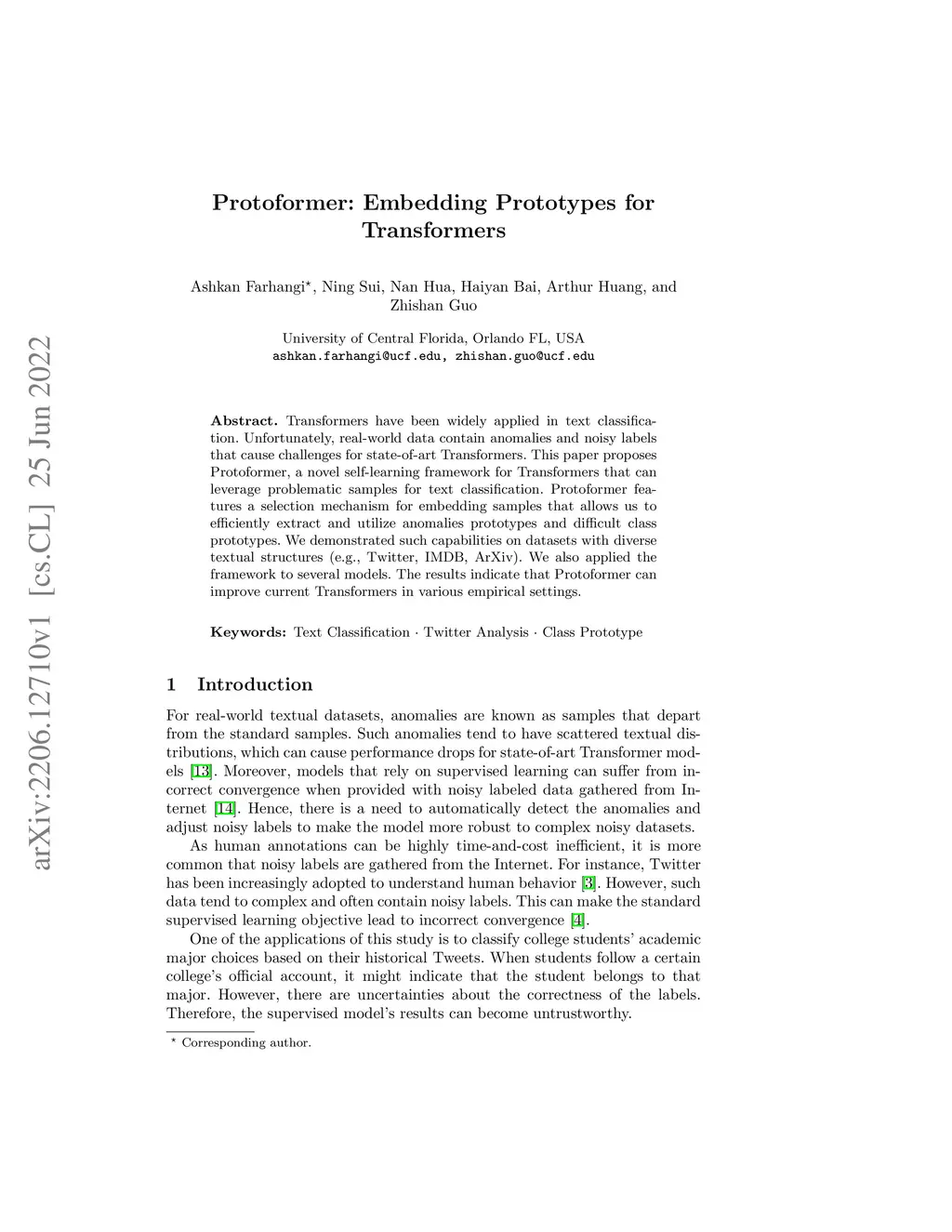 Transformers have been widely applied in text classification. Unfortunately, real-world data contain anomalies and noisy labels that cause challenges for state-of-art Transformers. This paper proposes Protoformer, a novel self-learning framework for Transformers that can leverage problematic samples for text classification. Protoformer features a selection mechanism for embedding samples that allows us to efficiently extract and utilize anomalies prototypes and difficult class prototypes. We demonstrated such capabilities on datasets with diverse textual structures (e.g., Twitter, IMDB, ArXiv). We also applied the framework to several models. The results indicate that Protoformer can improve current Transformers in various empirical settings.