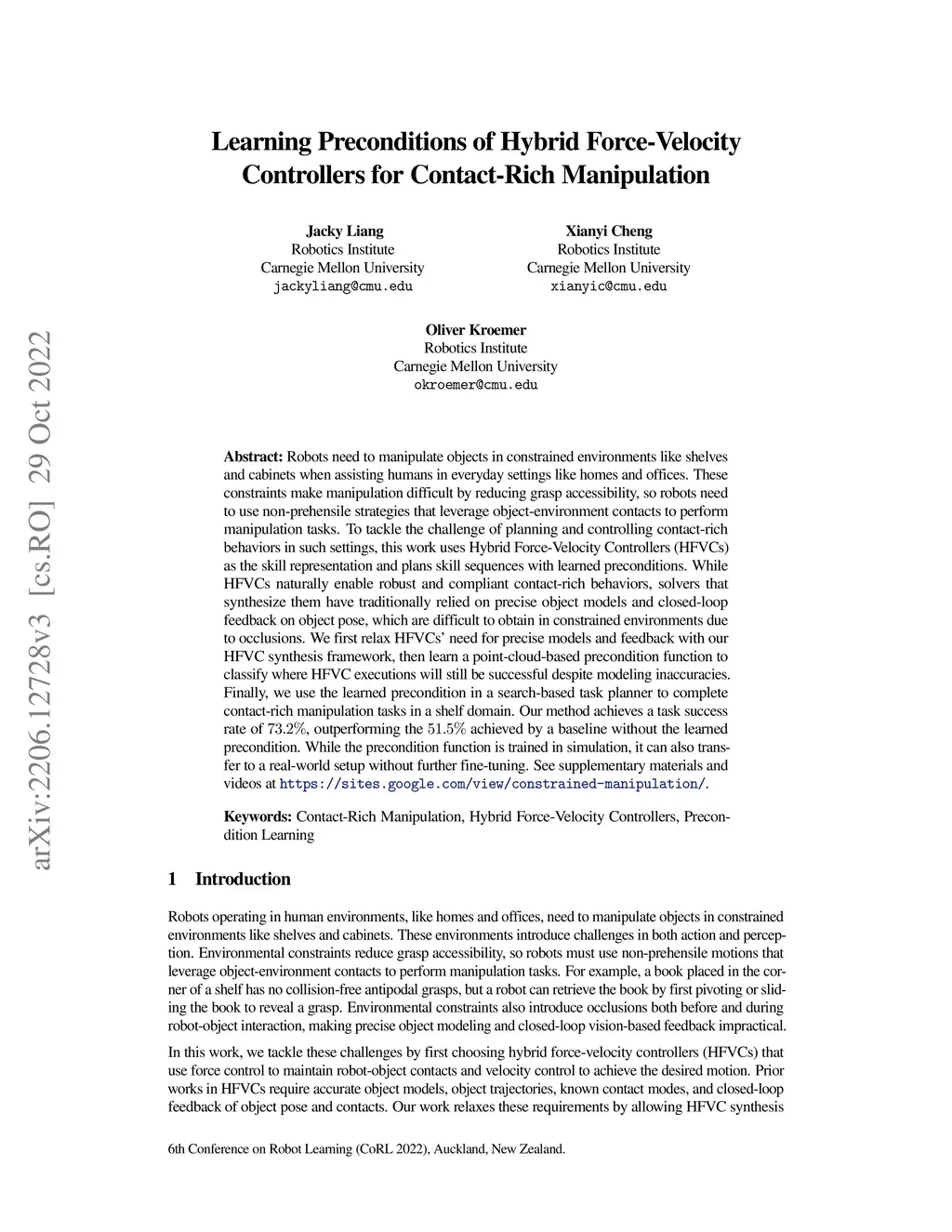 Learning Preconditions of Hybrid Force-Velocity Controllers for