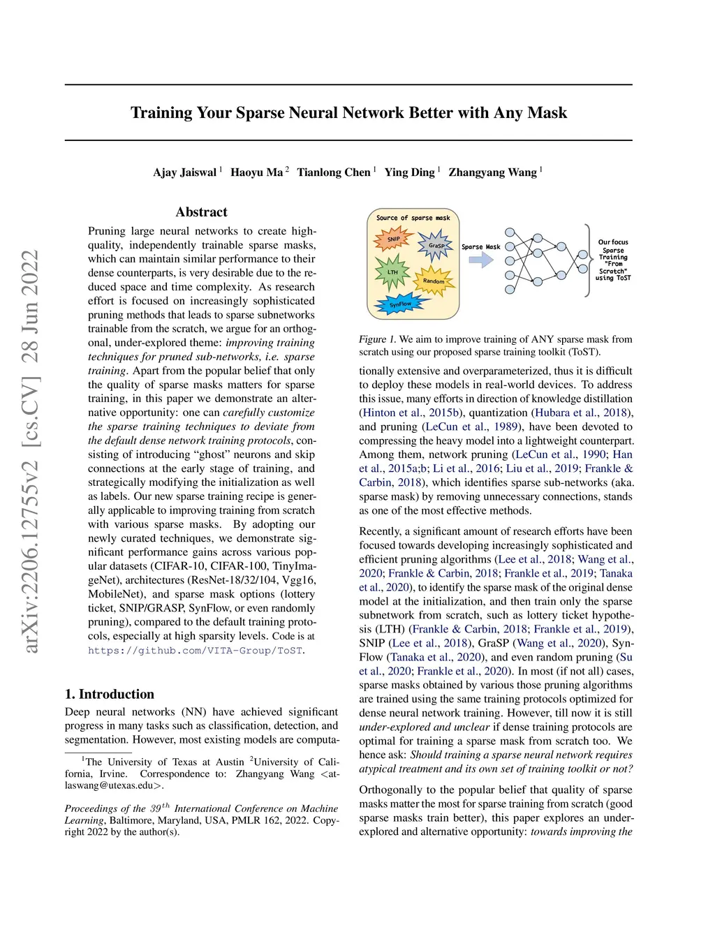 Pruning large neural networks to create high-quality, independently trainable sparse masks, which can maintain similar performance to their dense counterparts, is very desirable due to the reduced space and time complexity. As research effort is focused on increasingly sophisticated pruning methods that leads to sparse subnetworks trainable from the scratch, we argue for an orthogonal, under-explored theme: improving training techniques for pruned sub-networks, i.e. sparse training. Apart from the popular belief that only the quality of sparse masks matters for sparse training, in this paper we demonstrate an alternative opportunity: one can carefully customize the sparse training techniques to deviate from the default dense network training protocols, consisting of introducing ``ghost" neurons and skip connections at the early stage of training, and strategically modifying the initialization as well as labels. Our new sparse training recipe is generally applicable to improving training from scratch with various sparse masks. By adopting our newly curated techniques, we demonstrate significant performance gains across various popular datasets (CIFAR-10, CIFAR-100, TinyImageNet), architectures (ResNet-18/32/104, Vgg16, MobileNet), and sparse mask options (lottery ticket, SNIP/GRASP, SynFlow, or even randomly pruning), compared to the default training protocols, especially at high sparsity levels. Code is at https://github.com/VITA-Group/ToST