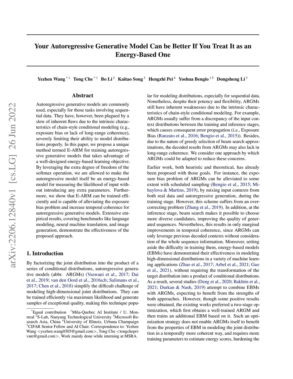 Autoregressive generative models are commonly used, especially for those tasks involving sequential data. They have, however, been plagued by a slew of inherent flaws due to the intrinsic characteristics of chain-style conditional modeling (e.g., exposure bias or lack of long-range coherence), severely limiting their ability to model distributions properly. In this paper, we propose a unique method termed E-ARM for training autoregressive generative models that takes advantage of a well-designed energy-based learning objective. By leveraging the extra degree of freedom of the softmax operation, we are allowed to make the autoregressive model itself be an energy-based model for measuring the likelihood of input without introducing any extra parameters. Furthermore, we show that E-ARM can be trained efficiently and is capable of alleviating the exposure bias problem and increase temporal coherence for autoregressive generative models. Extensive empirical results, covering benchmarks like language modeling, neural machine translation, and image generation, demonstrate the effectiveness of the proposed approach.